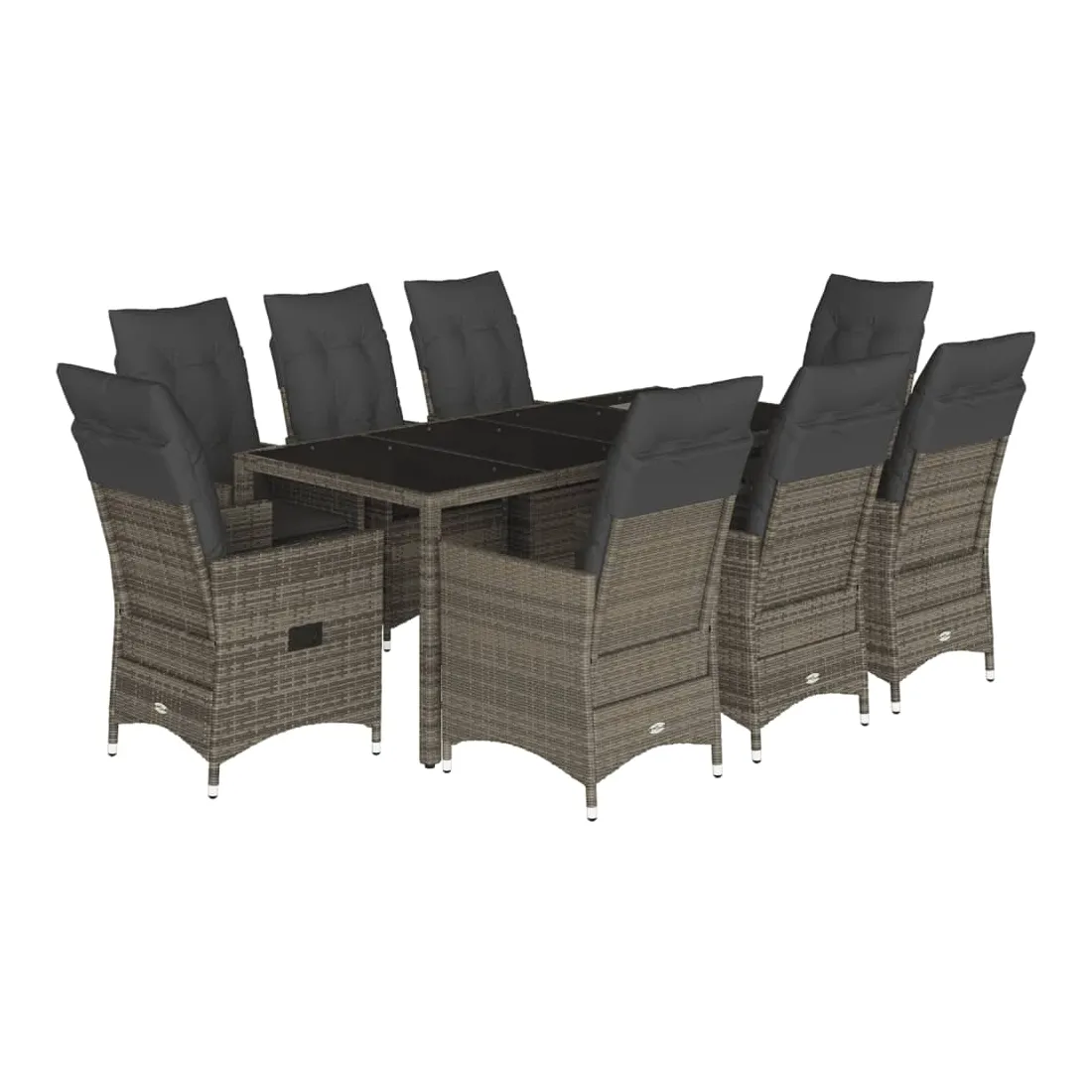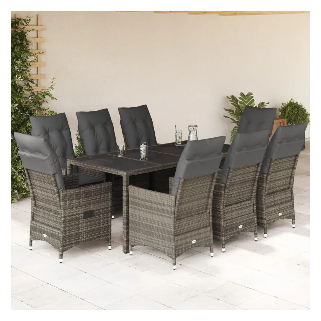 Cet ensemble de salle à manger de jardin est un excellent choix pour les repas en plein air ou pour vous détendre dans le jardin, dans l'arrière-cour ou sur la terrasse. Matériau durable : la résine tressée, également connue sous le nom de poly rotin, est un matériau synthétique solide et nécessitant peu d'entretien qui ressemble au rotin naturel. Il est léger, facile à nettoyer et couramment utilisé pour les meubles d'extérieur en raison de sa durabilité et de ses propriétés de résistance aux intempéries.Dossier réglable : ce siège de jardin est doté d'une poignée. Vous pouvez régler le dossier dans n'importe quelle position en tirant sur la poignée et le remettre rapidement dans sa position initiale.Dessus en verre : le dessus de la table d'extérieur est fabriqué en verre trempé solide et durable, ce qui le rend facile à nettoyer avec un chiffon humide et ajoute une touche d'élégance à votre espace extérieur.Expérience d'assise confortable : cet ensemble de meubles d'extérieur, doté de coussins épais, offre une expérience d'assise confortable.Housse amovible et lavable : ces coussins de siège sont dotés de housses amovibles pour un lavage et un entretien faciles. Les coussins de dossier ont un rabat à l'arrière pour une fixation facile aux dossiers. Bon à savoir :Pour que vos meubles d'extérieur restent beaux, nous vous recommandons de les protéger avec une housse imperméable.