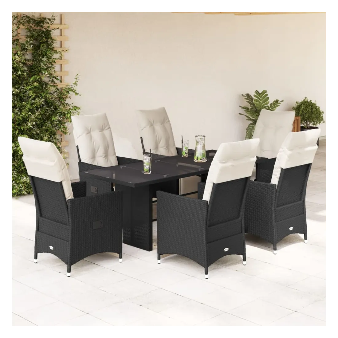 Cet ensemble de salle à manger de jardin est un excellent choix pour les repas en plein air ou pour vous détendre dans le jardin, dans l'arrière-cour ou sur la terrasse. Matériau durable : la résine tressée, également connue sous le nom de poly rotin, est un matériau synthétique solide et nécessitant peu d'entretien qui ressemble au rotin naturel. Il est léger, facile à nettoyer et couramment utilisé pour les meubles d'extérieur en raison de sa durabilité et de ses propriétés de résistance aux intempéries.Dossier et repose-pied réglables : ce siège de jardin est doté d'une poignée. Vous pouvez régler le dossier et le repose-pied dans n'importe quelle position en tirant sur la poignée, et les remettre rapidement dans leur position initiale.Dessus en verre : le dessus de la table d'extérieur est fabriqué en verre trempé solide et durable, ce qui le rend facile à nettoyer avec un chiffon humide et ajoute une touche d'élégance à votre espace extérieur.Expérience d'assise confortable : cet ensemble de meubles d'extérieur, doté de coussins épais, offre une expérience d'assise confortable.Housse amovible et lavable : ces coussins de siège sont dotés de housses amovibles pour un lavage et un entretien faciles. Les coussins de dossier ont un rabat à l'arrière pour une fixation facile aux dossiers. Bon à savoir :Pour que vos meubles d'extérieur restent beaux, nous vous recommandons de les protéger avec une housse imperméable.