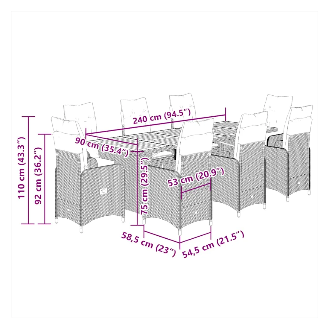 - 8 x chaise de jardin inclinable avec repose-pied