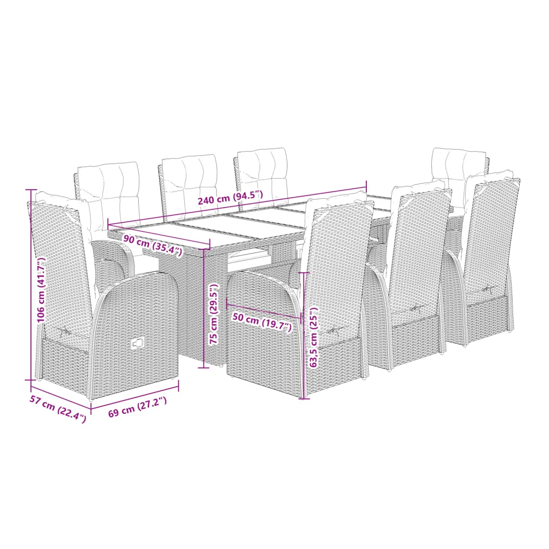 Cet ensemble de salle à manger de jardin est un excellent choix pour les repas en plein air ou pour vous détendre dans le jardin, dans l'arrière-cour ou sur la terrasse. Matériau durable : la résine tressée, également connue sous le nom de poly rotin, est un matériau synthétique solide et nécessitant peu d'entretien qui ressemble au rotin naturel. Il est léger, facile à nettoyer et couramment utilisé pour les meubles d'extérieur en raison de sa durabilité et de ses propriétés de résistance aux intempéries.Dossier et repose-pied réglables : ce siège de jardin est doté d'une poignée. Vous pouvez régler le dossier et le repose-pied dans n'importe quelle position en tirant sur la poignée, et le remettre rapidement dans sa position initiale.Expérience d'assise confortable : ce mobilier d'extérieur, doté de coussins épais, offre une expérience d'assise confortable.Housse amovible et lavable : ces coussins de siège sont dotés de housses amovibles pour un lavage et un entretien faciles.Dessus en verre : le dessus de la table d'extérieur est fabriqué en verre trempé solide et durable, ce qui le rend facile à nettoyer avec un chiffon humide et ajoute une touche d'élégance à votre espace extérieur. Bon à savoir :Pour que vos meubles d'extérieur restent beaux, nous vous recommandons de les protéger avec une housse imperméable.