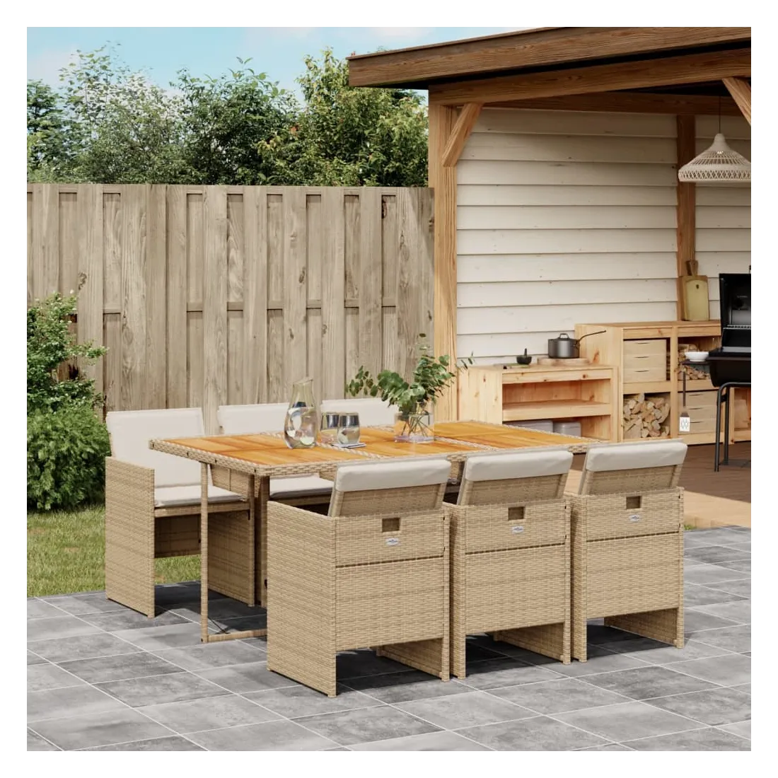 Cet ensemble de salle à manger de jardin est un excellent choix pour les repas en plein air ou pour vous détendre dans le jardin, dans l'arrière-cour ou sur la terrasse. Matériau durable : la résine tressée, également connue sous le nom de poly rotin, est un matériau synthétique solide et nécessitant peu d'entretien qui ressemble au rotin naturel. Il est léger, facile à nettoyer et couramment utilisé pour les meubles d'extérieur en raison de sa durabilité et de ses propriétés de résistance aux intempéries.Rangement compact : ces chaises sont dotées d'un dossier rabattable, ce qui permet de les ranger facilement sous la table. Une fois pliées, elles se rangent parfaitement sous la table, formant un cube peu encombrant. Expérience d'assise confortable : ce mobilier d'extérieur, doté de coussins épais, offre une expérience d'assise confortable.Housse amovible et lavable : ces coussins de siège sont dotés de housses amovibles pour un lavage et un entretien faciles.Dessus stable et facile à nettoyer : cette table de jardin a un dessus en bois d'acacia robuste, durable et facile à nettoyer avec un chiffon humide. Bon à savoir : Pour que vos meubles d'extérieur restent beaux, nous vous recommandons de les protéger avec une housse imperméable.