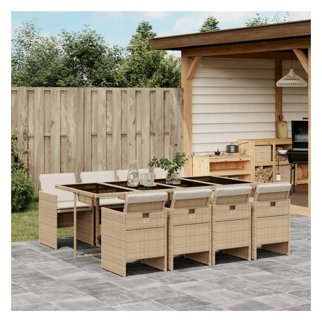 Cet ensemble de salle à manger de jardin est un excellent choix pour les repas en plein air ou pour vous détendre dans le jardin, dans l'arrière-cour ou sur la terrasse. Matériau durable : la résine tressée, également connue sous le nom de poly rotin, est un matériau synthétique solide et nécessitant peu d'entretien qui ressemble au rotin naturel. Il est léger, facile à nettoyer et couramment utilisé pour les meubles d'extérieur en raison de sa durabilité et de ses propriétés de résistance aux intempéries.Rangement compact : ces chaises sont dotées d'un dossier rabattable, ce qui permet de les ranger facilement sous la table. Une fois pliées, elles se rangent parfaitement sous la table, formant un cube peu encombrant. Expérience d'assise confortable : ce mobilier d'extérieur, doté de coussins épais, offre une expérience d'assise confortable.Housse amovible et lavable : ces coussins de siège sont dotés de housses amovibles pour un lavage et un entretien faciles.Dessus en verre : le dessus de la table d'extérieur est fabriqué en verre trempé solide et durable, ce qui le rend facile à nettoyer avec un chiffon humide et ajoute une touche d'élégance à votre espace extérieur. Bon à savoir : Pour que vos meubles d'extérieur restent beaux, nous vous recommandons de les protéger avec une housse imperméable.