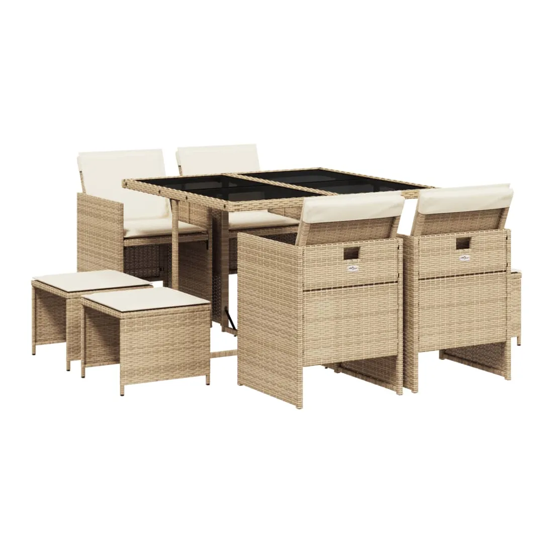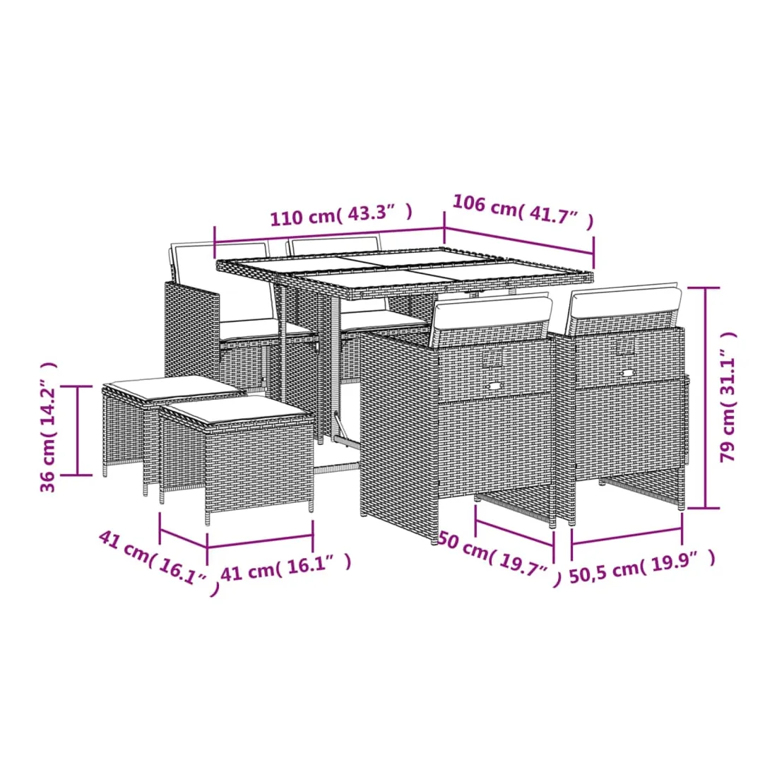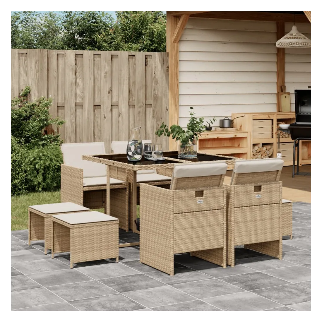 Cet ensemble de salle à manger de jardin est un excellent choix pour les repas en plein air ou pour vous détendre dans le jardin, dans l'arrière-cour ou sur la terrasse. Matériau durable : la résine tressée, également connue sous le nom de poly rotin, est un matériau synthétique solide et nécessitant peu d'entretien qui ressemble au rotin naturel. Il est léger, facile à nettoyer et couramment utilisé pour les meubles d'extérieur en raison de sa durabilité et de ses propriétés de résistance aux intempéries.Rangement compact : ces chaises sont dotées d'un dossier rabattable, ce qui permet de les ranger facilement sous la table. Une fois pliées, elles se rangent parfaitement sous la table, formant un cube peu encombrant. De plus, les tabourets peuvent également être rangés sous les chaises, maximisant encore davantage l'efficacité de l'espace. Expérience d'assise confortable : ce mobilier d'extérieur, doté de coussins épais, offre une expérience d'assise confortable.Housse amovible et lavable : ces coussins de siège sont dotés de housses amovibles pour un lavage et un entretien faciles.Dessus en verre : le dessus de la table d'extérieur est fabriqué en verre trempé solide et durable, ce qui le rend facile à nettoyer avec un chiffon humide et ajoute une touche d'élégance à votre espace extérieur. Bon à savoir : Pour que vos meubles d'extérieur restent beaux, nous vous recommandons de les protéger avec une housse imperméable.