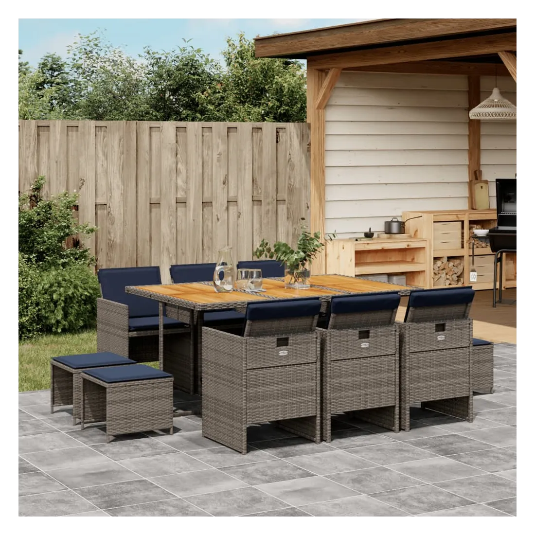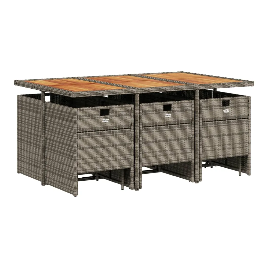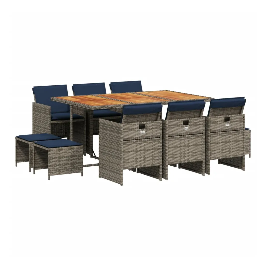 vidaXLCet ensemble de salle à manger de jardin est un excellent choix pour les repas en plein air ou pour vous détendre dans le jardin, dans l'arrière-cour ou sur la terrasse. Matériau durable : la résine tressée, également connue sous le nom de poly rotin, est un matériau synthétique solide et nécessitant peu d'entretien qui ressemble au rotin naturel. Elle est légère, facile à nettoyer et couramment utilisée pour les meubles d'extérieur en raison de sa durabilité et de ses propriétés de résistance aux intempéries.Rangement compact : ces chaises sont dotées d'un dossier rabattable, ce qui permet de les ranger facilement sous la table. Une fois pliées, elles se rangent parfaitement sous la table, formant un cube peu encombrant. De plus, les tabourets peuvent également être rangés sous les chaises, maximisant encore davantage l'efficacité de l'espace. Expérience d'assise confortable : ce mobilier d'extérieur, doté de coussins épais, offre une expérience d'assise confortable.Housse amovible et lavable : ces coussins de siège sont dotés de housses amovibles pour un lavage et un entretien faciles.Dessus stable et facile à nettoyer : cette table de jardin a un dessus en bois d'acacia robuste, durable et facile à nettoyer avec un chiffon humide. Bon à savoir : Pour que vos meubles d'extérieur restent beaux, nous vous recommandons de les protéger avec une housse imperméable.
