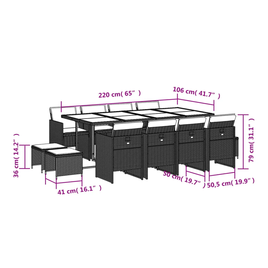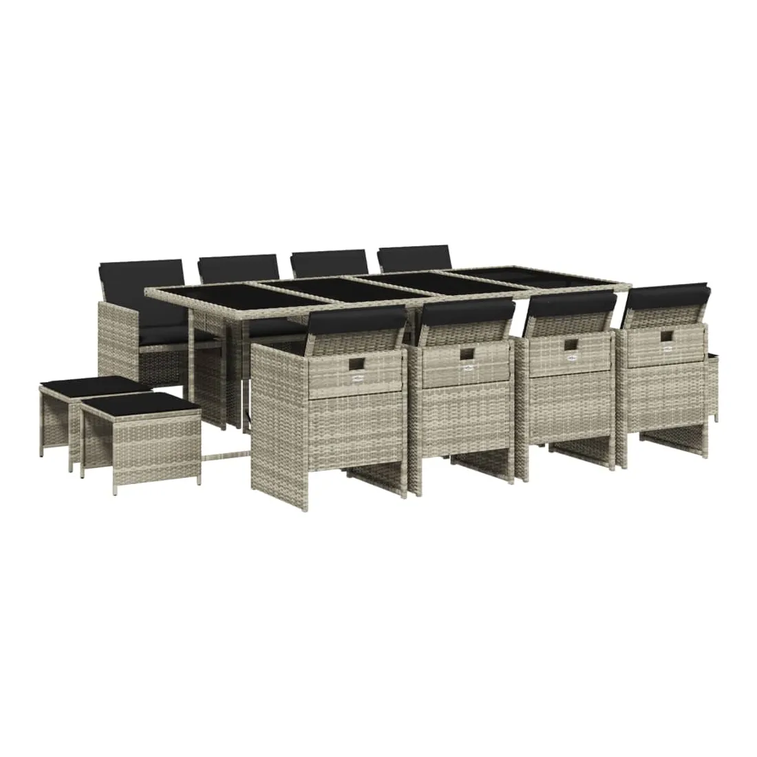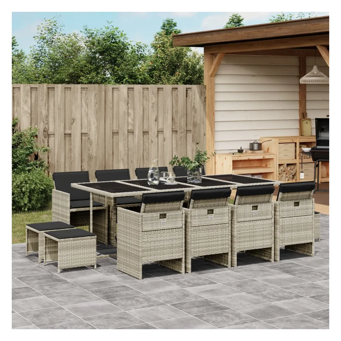 Cet ensemble de salle à manger de jardin est un excellent choix pour les repas en plein air ou pour vous détendre dans le jardin, dans l'arrière-cour ou sur la terrasse. Matériau durable : la résine tressée, également connue sous le nom de poly rotin, est un matériau synthétique solide et nécessitant peu d'entretien qui ressemble au rotin naturel. Il est léger, facile à nettoyer et couramment utilisé pour les meubles d'extérieur en raison de sa durabilité et de ses propriétés de résistance aux intempéries.Rangement compact : ces chaises sont dotées d'un dossier rabattable, ce qui permet de les ranger facilement sous la table. Une fois pliées, elles se rangent parfaitement sous la table, formant un cube peu encombrant. De plus, les tabourets peuvent également être rangés sous les chaises, maximisant encore davantage l'efficacité de l'espace. Expérience d'assise confortable : ce mobilier d'extérieur, doté de coussins épais, offre une expérience d'assise confortable.Housse amovible et lavable : ces coussins de siège sont dotés de housses amovibles pour un lavage et un entretien faciles.Dessus en verre : le dessus de la table d'extérieur est fabriqué en verre trempé solide et durable, ce qui le rend facile à nettoyer avec un chiffon humide et ajoute une touche d'élégance à votre espace extérieur. Bon à savoir : Pour que vos meubles d'extérieur restent beaux, nous vous recommandons de les protéger avec une housse imperméable.