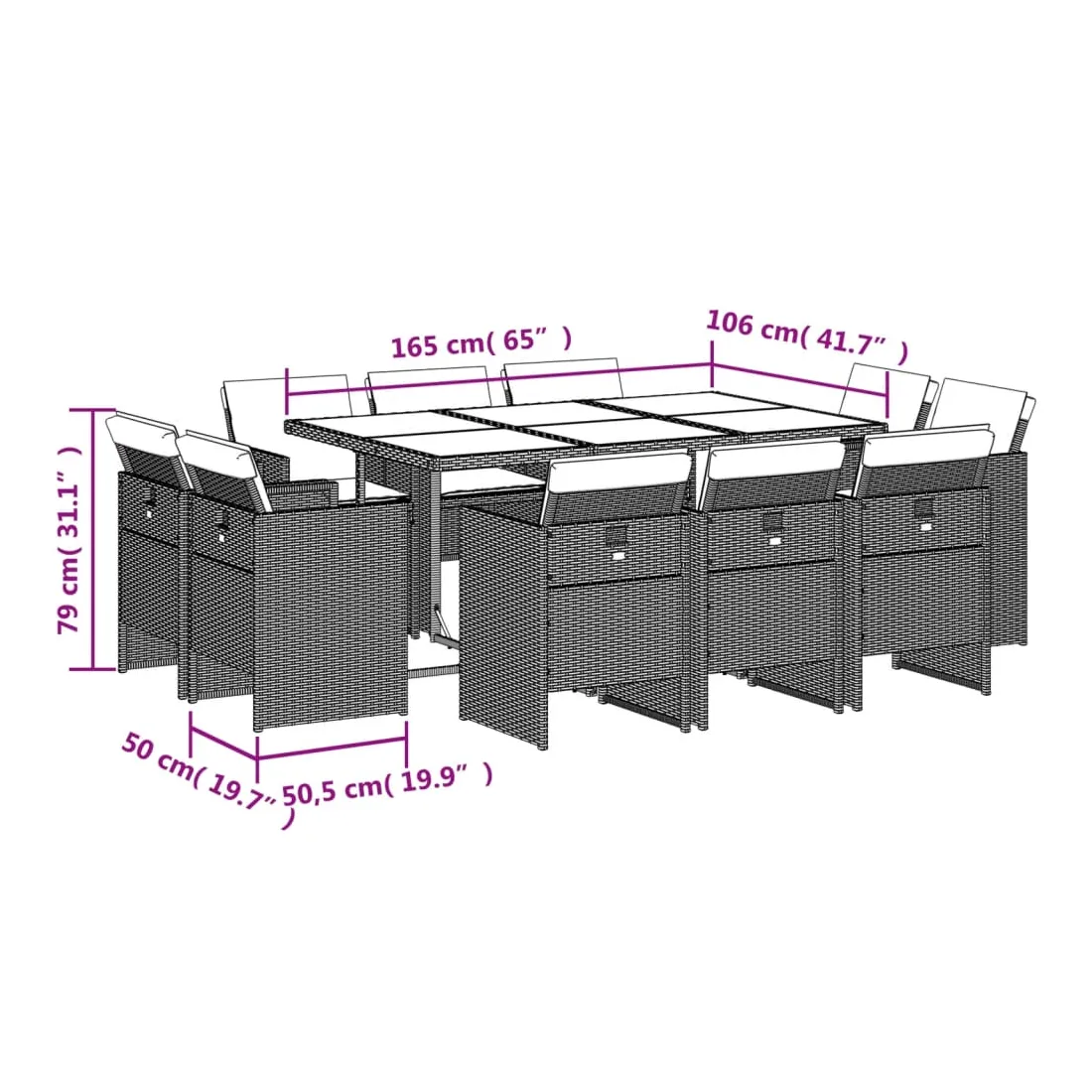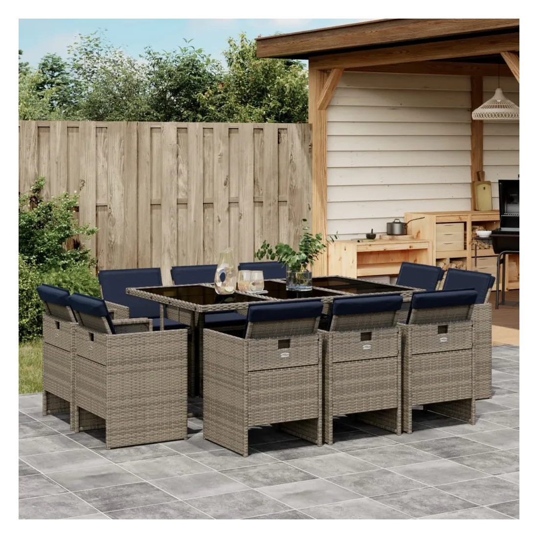 vidaXLCet ensemble de salle à manger de jardin est un excellent choix pour les repas en plein air ou pour vous détendre dans le jardin, dans l'arrière-cour ou sur la terrasse. Matériau durable : la résine tressée, également connue sous le nom de poly rotin, est un matériau synthétique solide et nécessitant peu d'entretien qui ressemble au rotin naturel. Elle est légère, facile à nettoyer et couramment utilisée pour les meubles d'extérieur en raison de sa durabilité et de ses propriétés de résistance aux intempéries.Rangement compact : ces chaises sont dotées d'un dossier rabattable, ce qui permet de les ranger facilement sous la table. Une fois pliées, elles se rangent parfaitement sous la table, formant un cube peu encombrant. Expérience d'assise confortable : ce mobilier d'extérieur, doté de coussins épais, offre une expérience d'assise confortable.Housse amovible et lavable : ces coussins de siège sont dotés de housses amovibles pour un lavage et un entretien faciles.Dessus en verre : le dessus de la table d'extérieur est fabriqué en verre trempé solide et durable, ce qui le rend facile à nettoyer avec un chiffon humide et ajoute une touche d'élégance à votre espace extérieur. Bon à savoir : Pour que vos meubles d'extérieur restent beaux, nous vous recommandons de les protéger avec une housse imperméable.