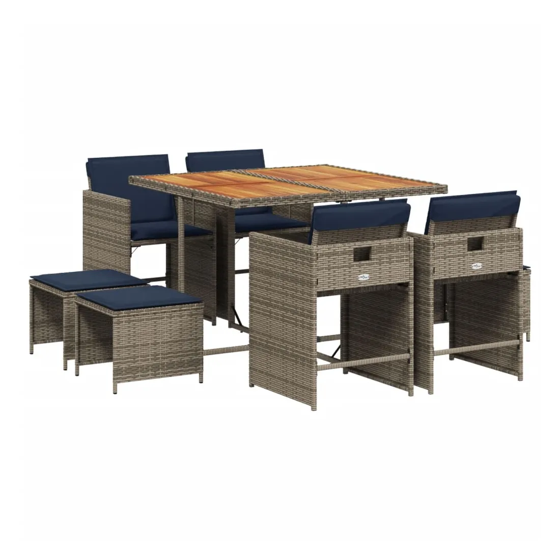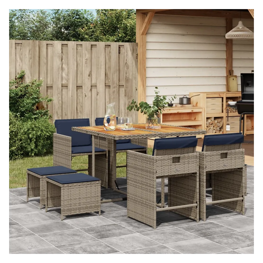 Cet ensemble de salle à manger de jardin est un excellent choix pour les repas en plein air ou pour vous détendre dans le jardin, dans l'arrière-cour ou sur la terrasse. Matériau durable : la résine tressée, également connue sous le nom de poly rotin, est un matériau synthétique solide et nécessitant peu d'entretien qui ressemble au rotin naturel. Elle est légère, facile à nettoyer et couramment utilisée pour les meubles d'extérieur en raison de sa durabilité et de ses propriétés de résistance aux intempéries.Rangement compact : ces chaises sont dotées d'un dossier rabattable, ce qui permet de les ranger facilement sous la table. Une fois pliées, elles se rangent parfaitement sous la table, formant un cube peu encombrant. De plus, les tabourets peuvent également être rangés sous les chaises, maximisant encore davantage l'efficacité de l'espace.Expérience d'assise confortable : ce mobilier d'extérieur, doté de coussins épais, offre une expérience d'assise confortable.Housse amovible et lavable : ces coussins de siège sont dotés de housses amovibles pour un lavage et un entretien faciles. Les housses de coussin de chaise ont un rabat à l'arrière pour une fixation facile aux chaises.Dessus stable et facile à nettoyer : cette table de jardin a un dessus en bois d'acacia robuste, durable et facile à nettoyer avec un chiffon humide. Bon à savoir : Pour que vos meubles d'extérieur restent beaux, nous vous recommandons de les protéger avec une housse imperméable.