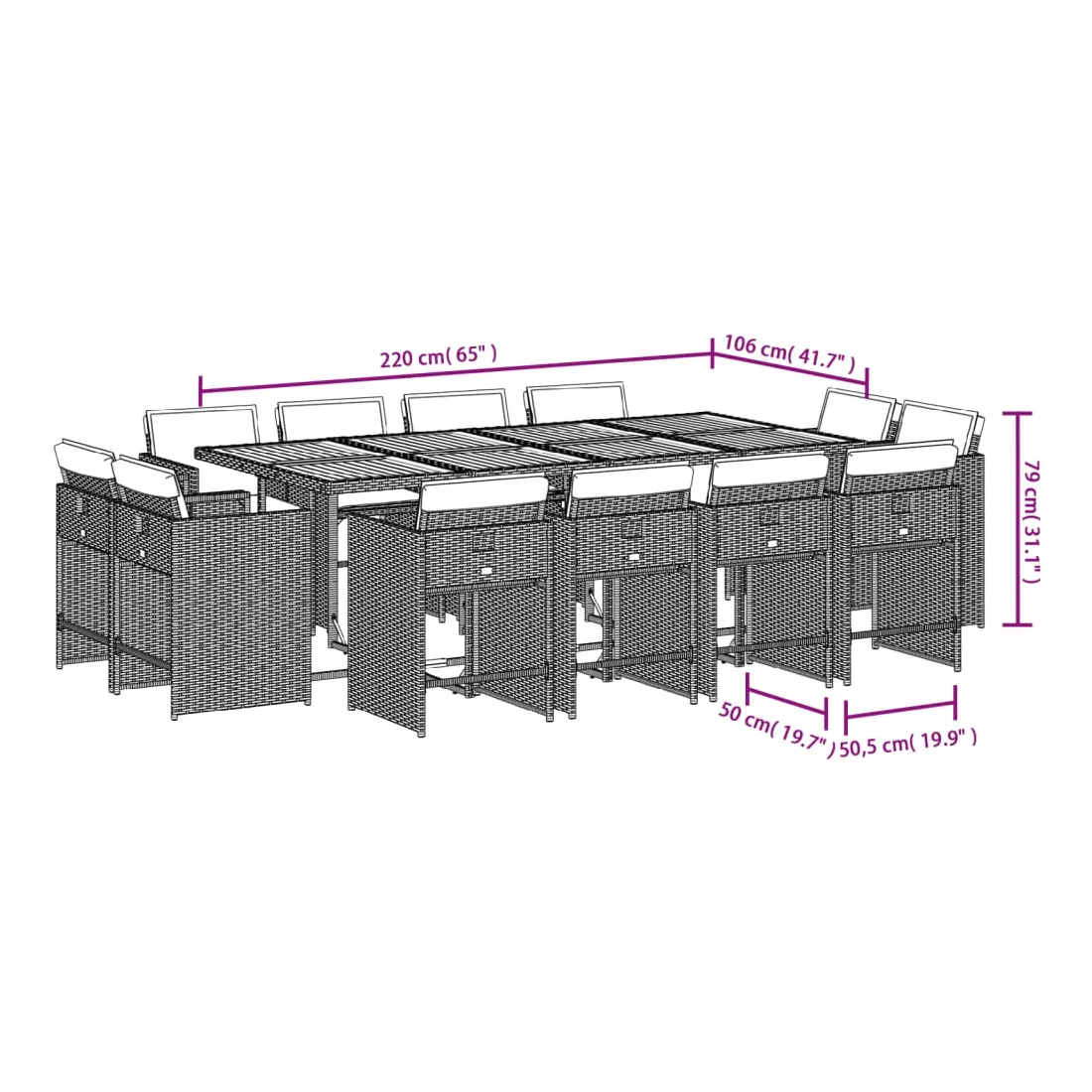 vidaXLCet ensemble de salle à manger de jardin est un excellent choix pour les repas en plein air ou pour vous détendre dans le jardin, dans l'arrière-cour ou sur la terrasse. Matériau durable : la résine tressée, également connue sous le nom de poly rotin, est un matériau synthétique solide et nécessitant peu d'entretien qui ressemble au rotin naturel. Elle est légère, facile à nettoyer et couramment utilisée pour les meubles d'extérieur en raison de sa durabilité et de ses propriétés de résistance aux intempéries.Rangement compact : ces chaises sont dotées d'un dossier rabattable, ce qui permet de les ranger facilement sous la table. Une fois pliées, elles se rangent parfaitement sous la table, formant un cube peu encombrant.Expérience d'assise confortable : ce mobilier d'extérieur, doté de coussins épais, offre une expérience d'assise confortable.Housse amovible et lavable : ces coussins de siège sont dotés de housses amovibles pour un lavage et un entretien faciles. Les housses de coussin de chaise ont un rabat à l'arrière pour une fixation facile aux chaises.Dessus stable et facile à nettoyer : cette table de jardin a un dessus en bois d'acacia robuste, durable et facile à nettoyer avec un chiffon humide. Bon à savoir : Pour que vos meubles d'extérieur restent beaux, nous vous recommandons de les protéger avec une housse imperméable.