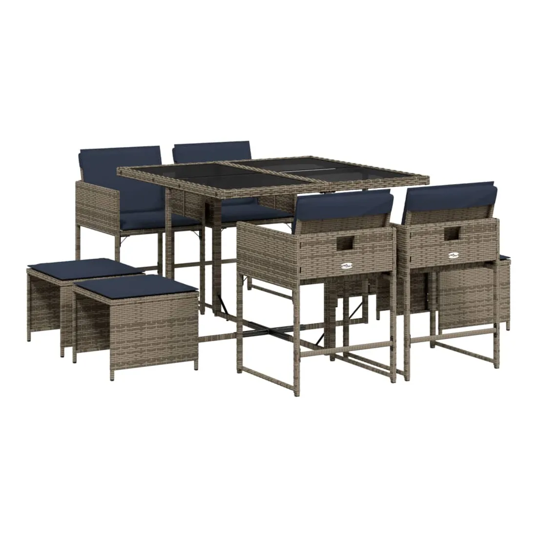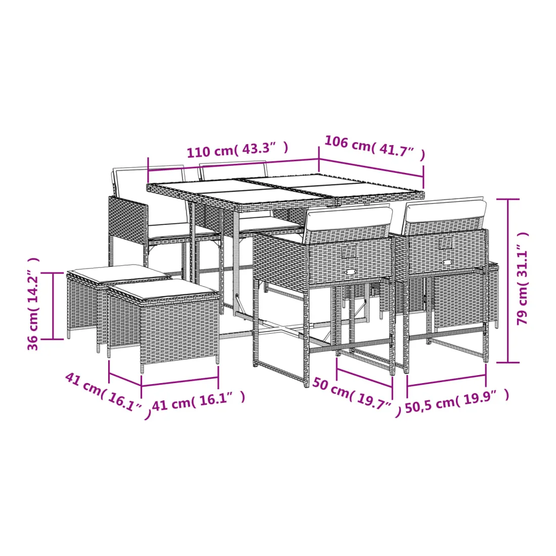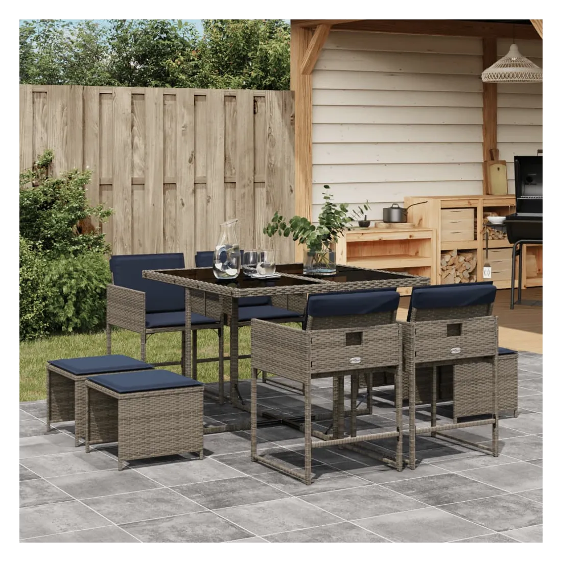 Cet ensemble de salle à manger de jardin est un excellent choix pour les repas en plein air ou pour vous détendre dans le jardin, dans l'arrière-cour ou sur la terrasse. Matériau durable : la résine tressée, également connue sous le nom de poly rotin, est un matériau synthétique solide et nécessitant peu d'entretien qui ressemble au rotin naturel. Elle est légère, facile à nettoyer et couramment utilisée pour les meubles d'extérieur en raison de sa durabilité et de ses propriétés de résistance aux intempéries.Rangement compact : ces chaises sont dotées d'un dossier rabattable, ce qui permet de les ranger facilement sous la table. Une fois pliées, elles se rangent parfaitement sous la table, formant un cube peu encombrant. De plus, les tabourets peuvent également être rangés sous les chaises, maximisant encore davantage l'efficacité de l'espace.Expérience d'assise confortable : ce mobilier d'extérieur, doté de coussins épais, offre une expérience d'assise confortable.Housse amovible et lavable : ces coussins de siège sont dotés de housses amovibles pour un lavage et un entretien faciles. Les housses de coussin ont un rabat à l'arrière pour une fixation facile aux dossiers.Dessus en verre : le dessus de la table d'extérieur est fabriqué en verre trempé solide et durable, ce qui le rend facile à nettoyer avec un chiffon humide et ajoute une touche d'élégance à votre espace extérieur. Bon à savoir : Pour que vos meubles d'extérieur restent beaux, nous vous recommandons de les protéger avec une housse imperméable.