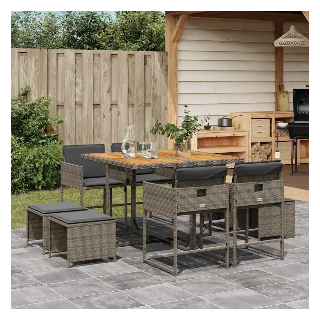 Cet ensemble de salle à manger de jardin est un excellent choix pour les repas en plein air ou pour vous détendre dans le jardin, dans l'arrière-cour ou sur la terrasse. Matériau durable : la résine tressée, également connue sous le nom de poly rotin, est un matériau synthétique solide et nécessitant peu d'entretien qui ressemble au rotin naturel. Il est léger, facile à nettoyer et couramment utilisé pour les meubles d'extérieur en raison de sa durabilité et de ses propriétés de résistance aux intempéries.Rangement compact : ces chaises sont dotées d'un dossier rabattable, ce qui permet de les ranger facilement sous la table. Une fois pliées, elles se rangent parfaitement sous la table, formant un cube peu encombrant. De plus, les tabourets peuvent également être rangés sous les chaises, maximisant encore davantage l'efficacité de l'espace.Expérience d'assise confortable : ce mobilier d'extérieur, doté de coussins épais, offre une expérience d'assise confortable.Housse amovible et lavable : ces coussins de siège sont dotés de housses amovibles pour un lavage et un entretien faciles. Les housses de coussin ont un rabat à l'arrière pour une fixation facile aux dossiers.Dessus stable et facile à nettoyer : cette table de jardin a un dessus en bois d'acacia robuste, durable et facile à nettoyer avec un chiffon humide. Bon à savoir : Pour que vos meubles d'extérieur restent beaux, nous vous recommandons de les protéger avec une housse imperméable.