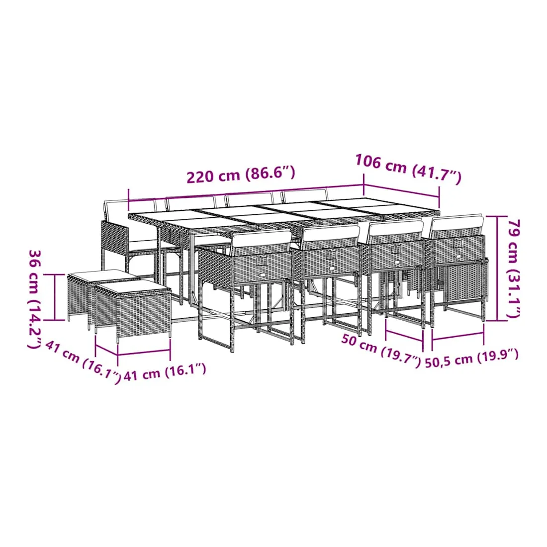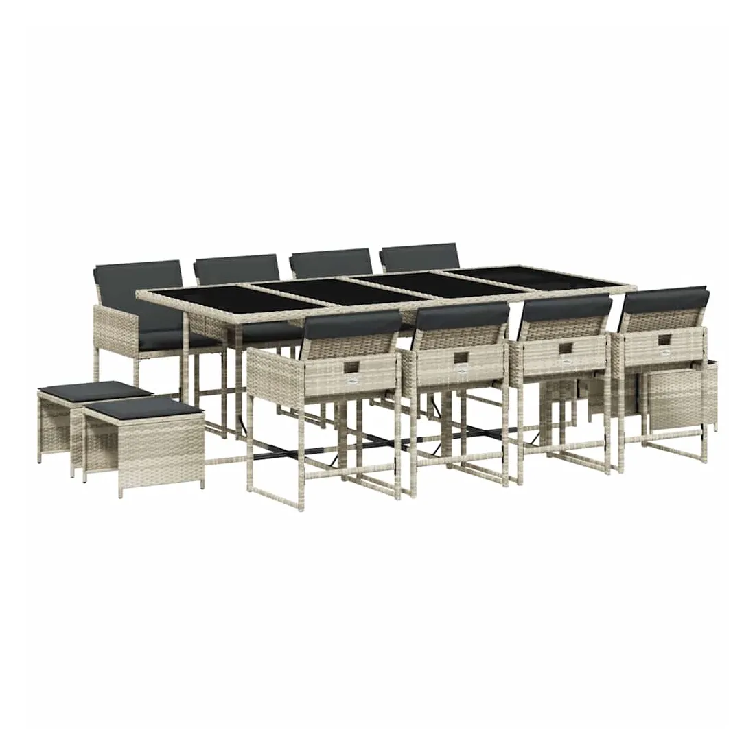 Cet ensemble de salle à manger de jardin est un excellent choix pour les repas en plein air ou pour vous détendre dans le jardin, dans l'arrière-cour ou sur la terrasse. Matériau durable : la résine tressée, également connue sous le nom de poly rotin, est un matériau synthétique solide et nécessitant peu d'entretien qui ressemble au rotin naturel. Il est léger, facile à nettoyer et couramment utilisé pour les meubles d'extérieur en raison de sa durabilité et de ses propriétés de résistance aux intempéries.Rangement compact : ces chaises sont dotées d'un dossier rabattable, ce qui permet de les ranger facilement sous la table. Une fois pliées, elles se rangent parfaitement sous la table, formant un cube peu encombrant. De plus, les tabourets peuvent également être rangés sous les chaises, maximisant encore davantage l'efficacité de l'espace.Expérience d'assise confortable : ce mobilier d'extérieur, doté de coussins épais, offre une expérience d'assise confortable.Housse amovible et lavable : ces coussins de siège sont dotés de housses amovibles pour un lavage et un entretien faciles. Les housses de coussin ont un rabat à l'arrière pour une fixation facile aux dossiers.Dessus en verre : le dessus de la table d'extérieur est fabriqué en verre trempé solide et durable, ce qui le rend facile à nettoyer avec un chiffon humide et ajoute une touche d'élégance à votre espace extérieur. Bon à savoir : Pour que vos meubles d'extérieur restent beaux, nous vous recommandons de les protéger avec une housse imperméable.