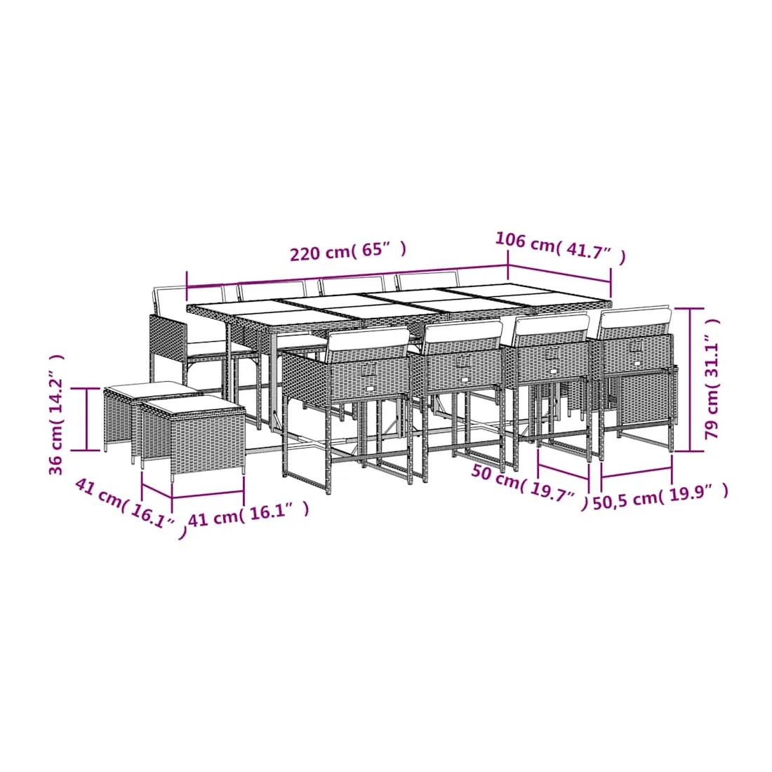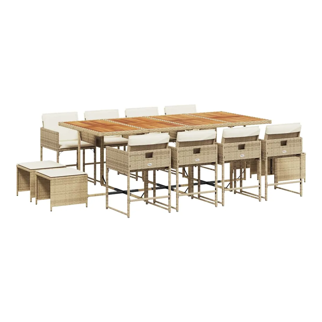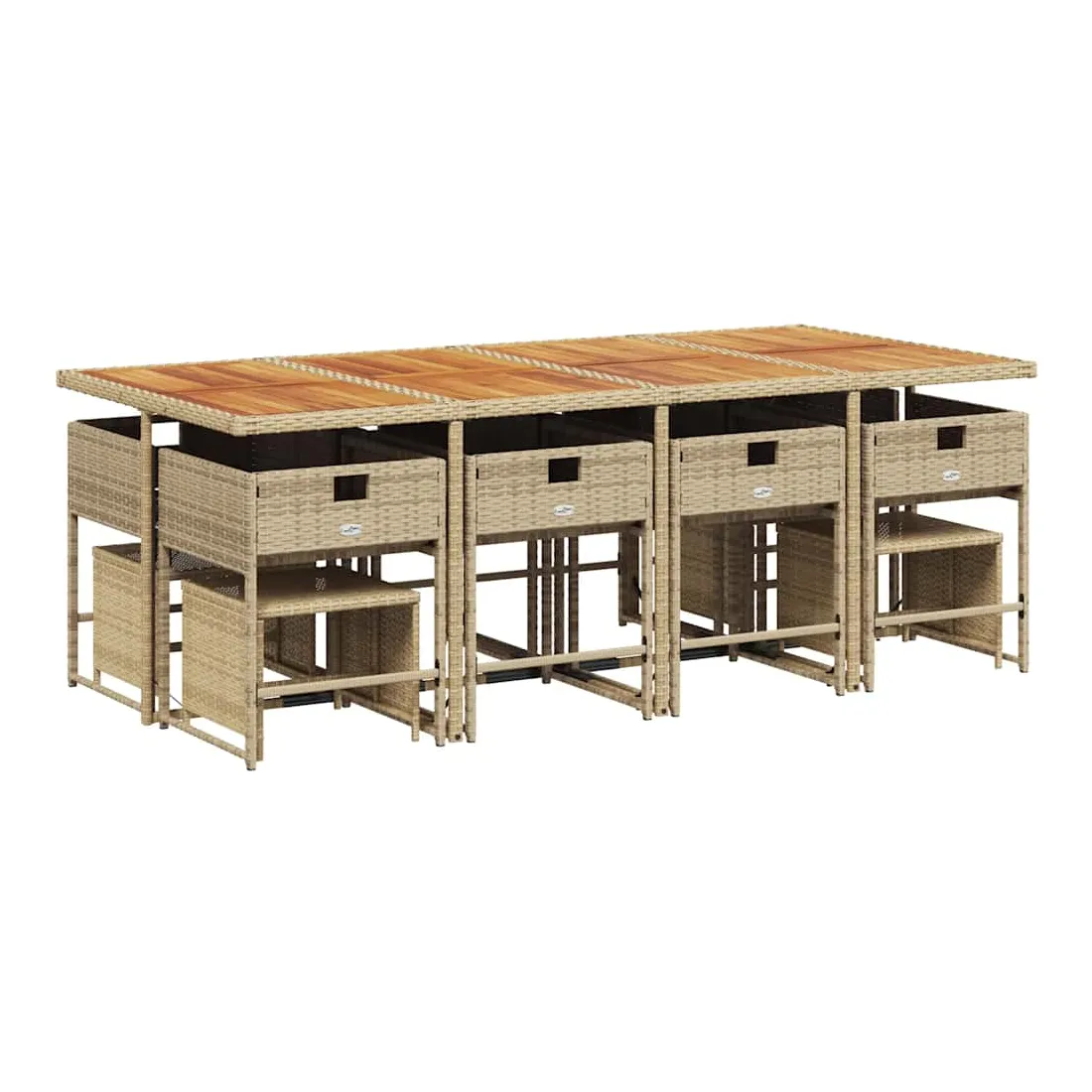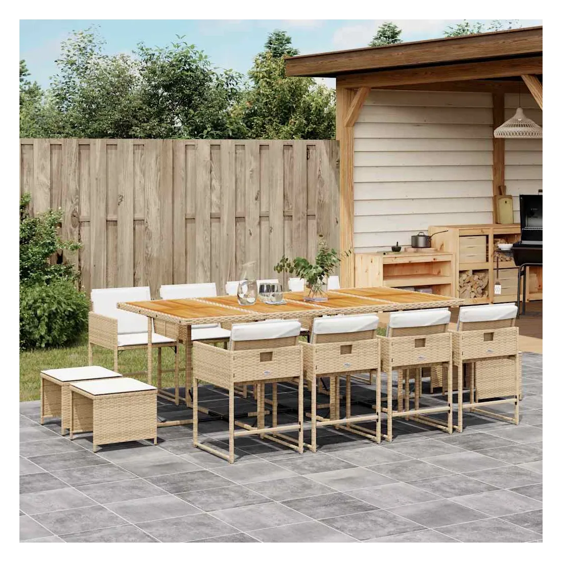Cet ensemble de salle à manger de jardin est un excellent choix pour les repas en plein air ou pour vous détendre dans le jardin, dans l'arrière-cour ou sur la terrasse. Matériau durable : la résine tressée, également connue sous le nom de poly rotin, est un matériau synthétique solide et nécessitant peu d'entretien qui ressemble au rotin naturel. Il est léger, facile à nettoyer et couramment utilisé pour les meubles d'extérieur en raison de sa durabilité et de ses propriétés de résistance aux intempéries.Rangement compact : ces chaises sont dotées d'un dossier rabattable, ce qui permet de les ranger facilement sous la table. Une fois pliées, elles se rangent parfaitement sous la table, formant un cube peu encombrant. De plus, les tabourets peuvent également être rangés sous les chaises, maximisant encore davantage l'efficacité de l'espace.Expérience d'assise confortable : ce mobilier d'extérieur, doté de coussins épais, offre une expérience d'assise confortable.Housse amovible et lavable : ces coussins de siège sont dotés de housses amovibles pour un lavage et un entretien faciles. Les housses de coussin ont un rabat à l'arrière pour une fixation facile aux dossiers.Dessus stable et facile à nettoyer : cette table de jardin a un dessus en bois d'acacia robuste, durable et facile à nettoyer avec un chiffon humide. Bon à savoir : Pour que vos meubles d'extérieur restent beaux, nous vous recommandons de les protéger avec une housse imperméable.