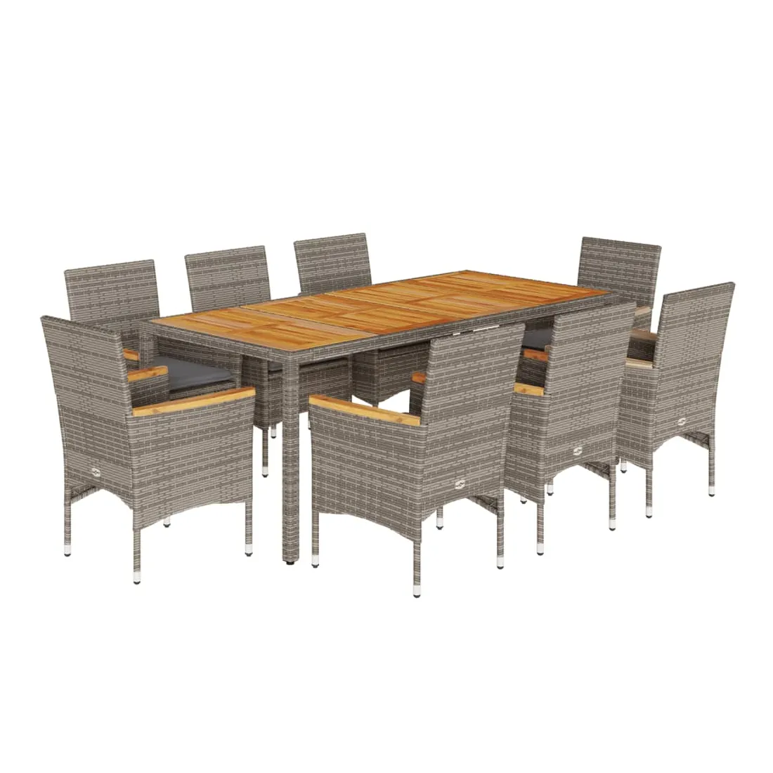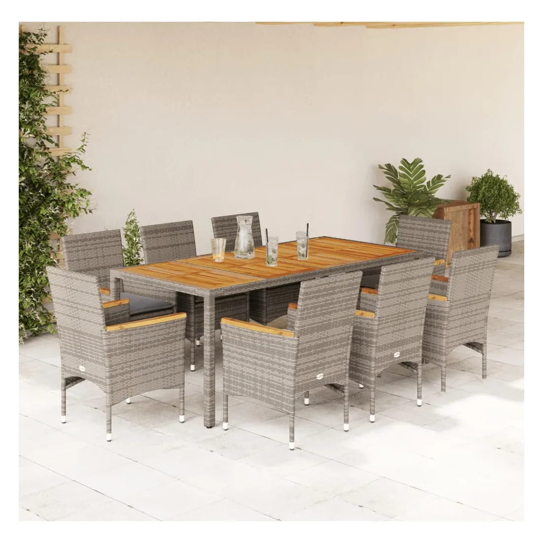 Cet ensemble de salle à manger de jardin est un excellent choix pour les repas en plein air ou pour vous détendre dans le jardin, dans l'arrière-cour ou sur la terrasse. Matériau durable : la résine tressée, également connue sous le nom de poly rotin, est un matériau synthétique solide et nécessitant peu d'entretien qui ressemble au rotin naturel. Il est léger, facile à nettoyer et couramment utilisé pour les meubles d'extérieur en raison de sa durabilité et de ses propriétés de résistance aux intempéries.Expérience d'assise confortable : cet ensemble de meubles d'extérieur, doté de coussins épais, offre une expérience d'assise confortable.Housse amovible et lavable : ces coussins de siège sont dotés de housses amovibles pour un lavage et un entretien faciles.Dessus stable et facile à nettoyer : cette table de jardin a un dessus en bois d'acacia robuste, durable et facile à nettoyer avec un chiffon humide. Bon à savoir :Pour que vos meubles d'extérieur restent beaux, nous vous recommandons de les protéger avec une housse imperméable.