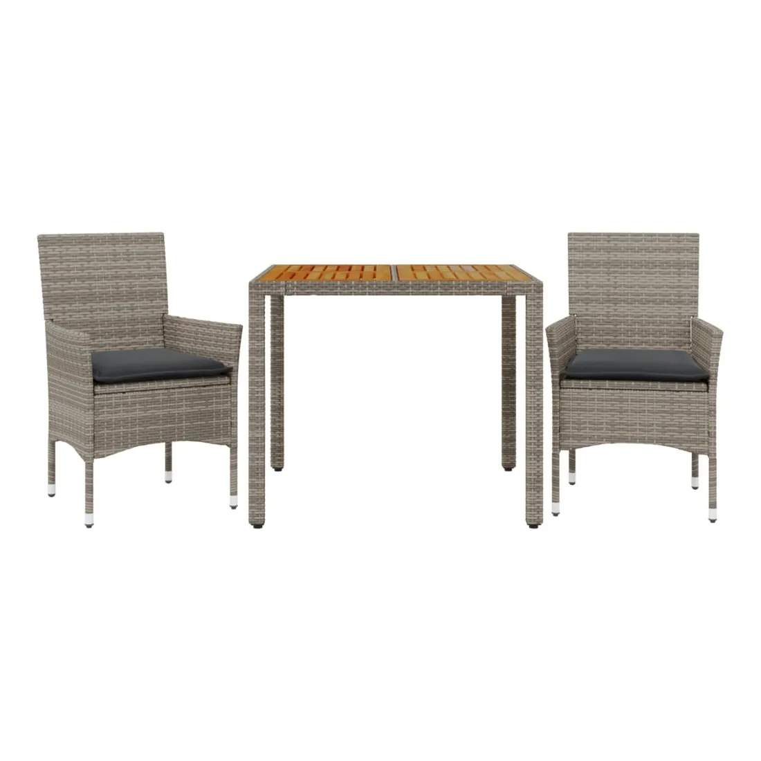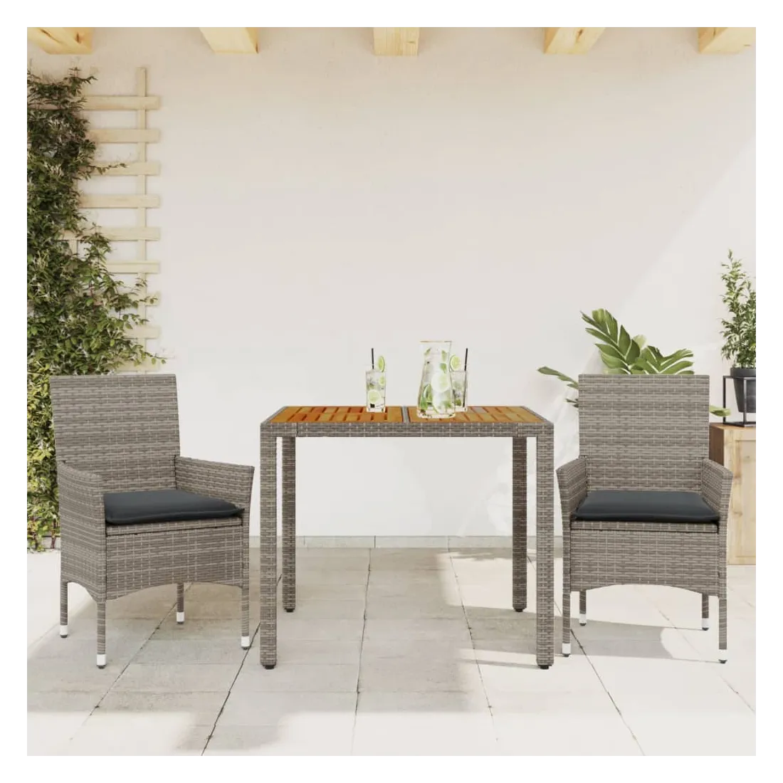 Cet ensemble de salle à manger de jardin est un excellent choix pour les repas en plein air ou pour vous détendre dans le jardin, dans l'arrière-cour ou sur la terrasse. Matériau durable : la résine tressée, également connue sous le nom de poly rotin, est un matériau synthétique solide et nécessitant peu d'entretien qui ressemble au rotin naturel. Il est léger, facile à nettoyer et couramment utilisé pour les meubles d'extérieur en raison de sa durabilité et de ses propriétés de résistance aux intempéries.Expérience d'assise confortable : cet ensemble de meubles d'extérieur, doté de coussins épais, offre une expérience d'assise confortable.Housse amovible et lavable : ces coussins de siège sont dotés de housses amovibles pour un lavage et un entretien faciles.Dessus stable et facile à nettoyer : cette table de jardin a un dessus en bois d'acacia robuste, durable et facile à nettoyer avec un chiffon humide. Bon à savoir :Pour que vos meubles d'extérieur restent beaux, nous vous recommandons de les protéger avec une housse imperméable.