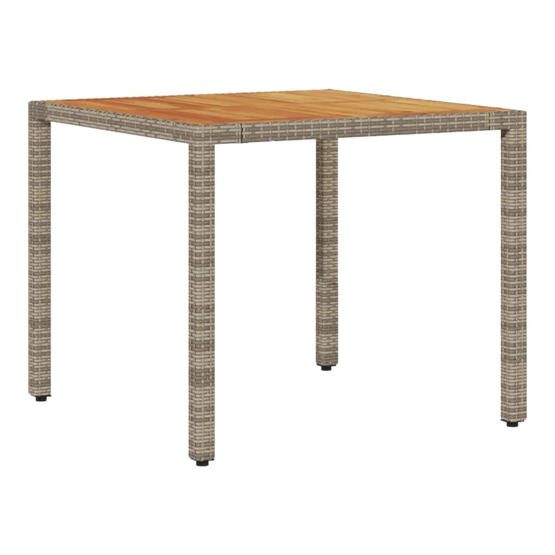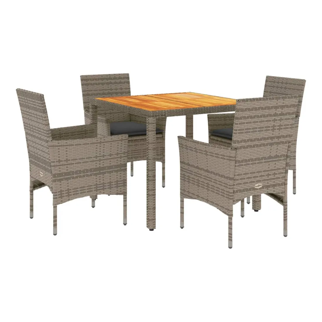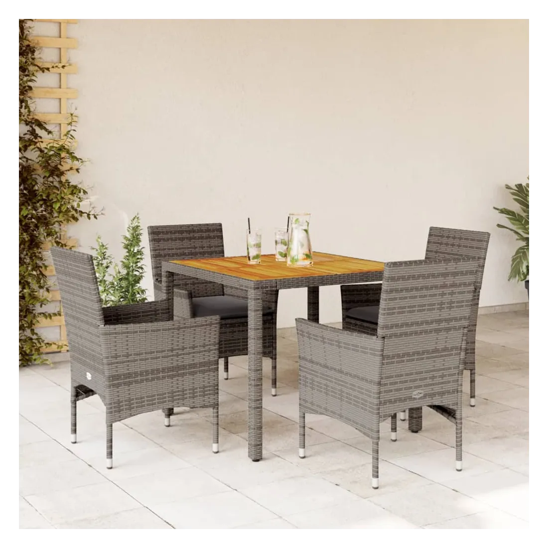 Cet ensemble de salle à manger de jardin est un excellent choix pour les repas en plein air ou pour vous détendre dans le jardin, dans l'arrière-cour ou sur la terrasse. Matériau durable : la résine tressée, également connue sous le nom de poly rotin, est un matériau synthétique solide et nécessitant peu d'entretien qui ressemble au rotin naturel. Il est léger, facile à nettoyer et couramment utilisé pour les meubles d'extérieur en raison de sa durabilité et de ses propriétés de résistance aux intempéries.Expérience d'assise confortable : cet ensemble de meubles d'extérieur, doté de coussins épais, offre une expérience d'assise confortable.Housse amovible et lavable : ces coussins de siège sont dotés de housses amovibles pour un lavage et un entretien faciles.Dessus stable et facile à nettoyer : cette table de jardin a un dessus en bois d'acacia robuste, durable et facile à nettoyer avec un chiffon humide. Bon à savoir :Pour que vos meubles d'extérieur restent beaux, nous vous recommandons de les protéger avec une housse imperméable.