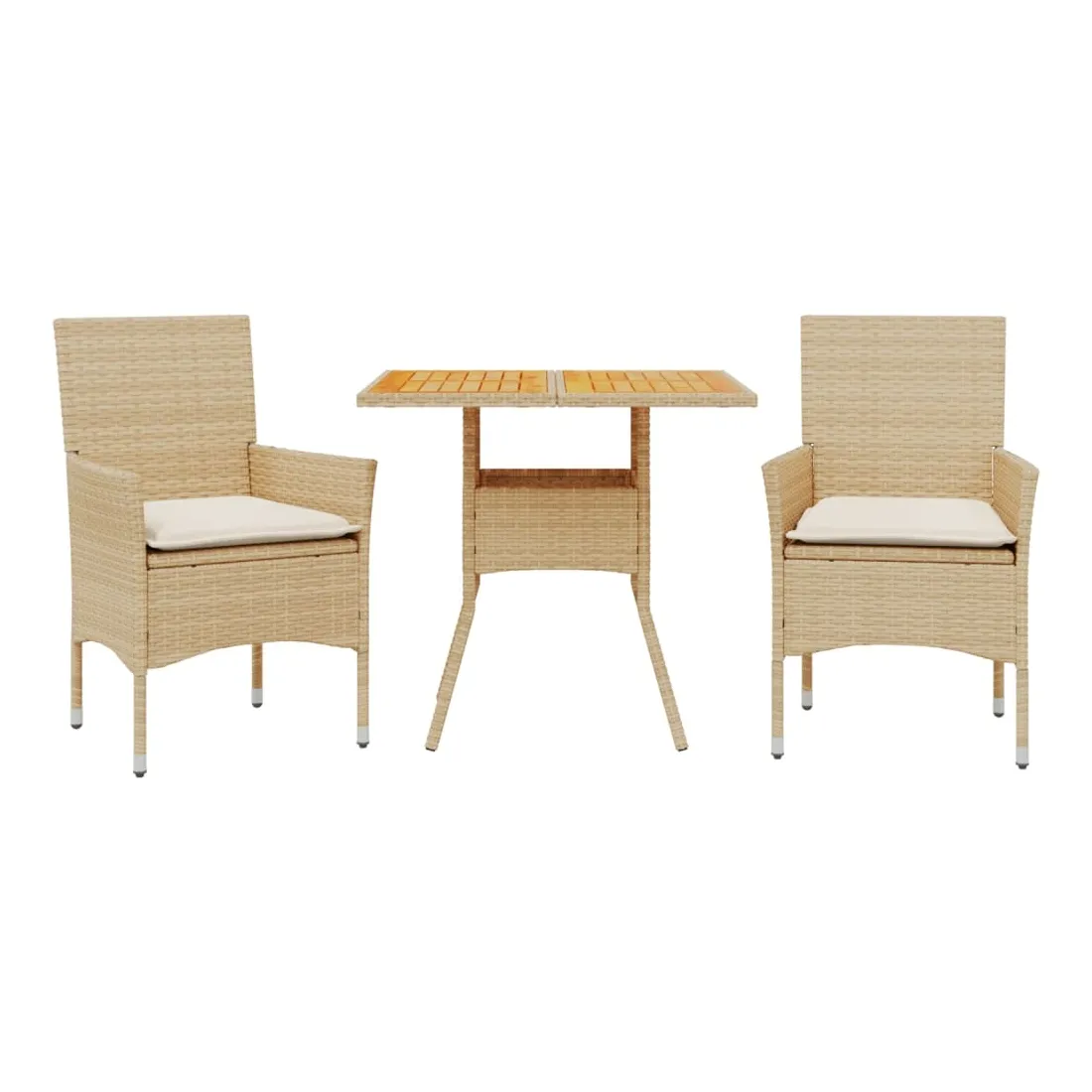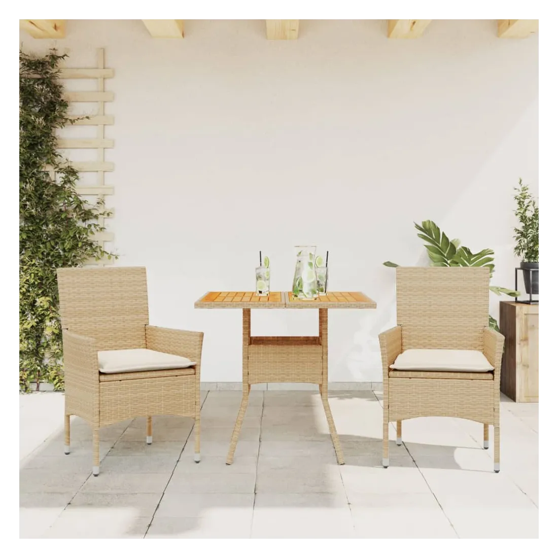 Cet ensemble de salle à manger de jardin est un excellent choix pour les repas en plein air ou pour vous détendre dans le jardin, dans l'arrière-cour ou sur la terrasse. Matériau durable : la résine tressée, également connue sous le nom de poly rotin, est un matériau synthétique solide et nécessitant peu d'entretien qui ressemble au rotin naturel. Il est léger, facile à nettoyer et couramment utilisé pour les meubles d'extérieur en raison de sa durabilité et de ses propriétés de résistance aux intempéries.Expérience d'assise confortable : cet ensemble de meubles d'extérieur, doté de coussins épais, offre une expérience d'assise confortable.Housse amovible et lavable : ces coussins de siège sont dotés de housses amovibles pour un lavage et un entretien faciles.Dessus stable et facile à nettoyer : cette table de jardin a un dessus en bois d'acacia robuste, durable et facile à nettoyer avec un chiffon humide. Bon à savoir :Pour que vos meubles d'extérieur restent beaux, nous vous recommandons de les protéger avec une housse imperméable.