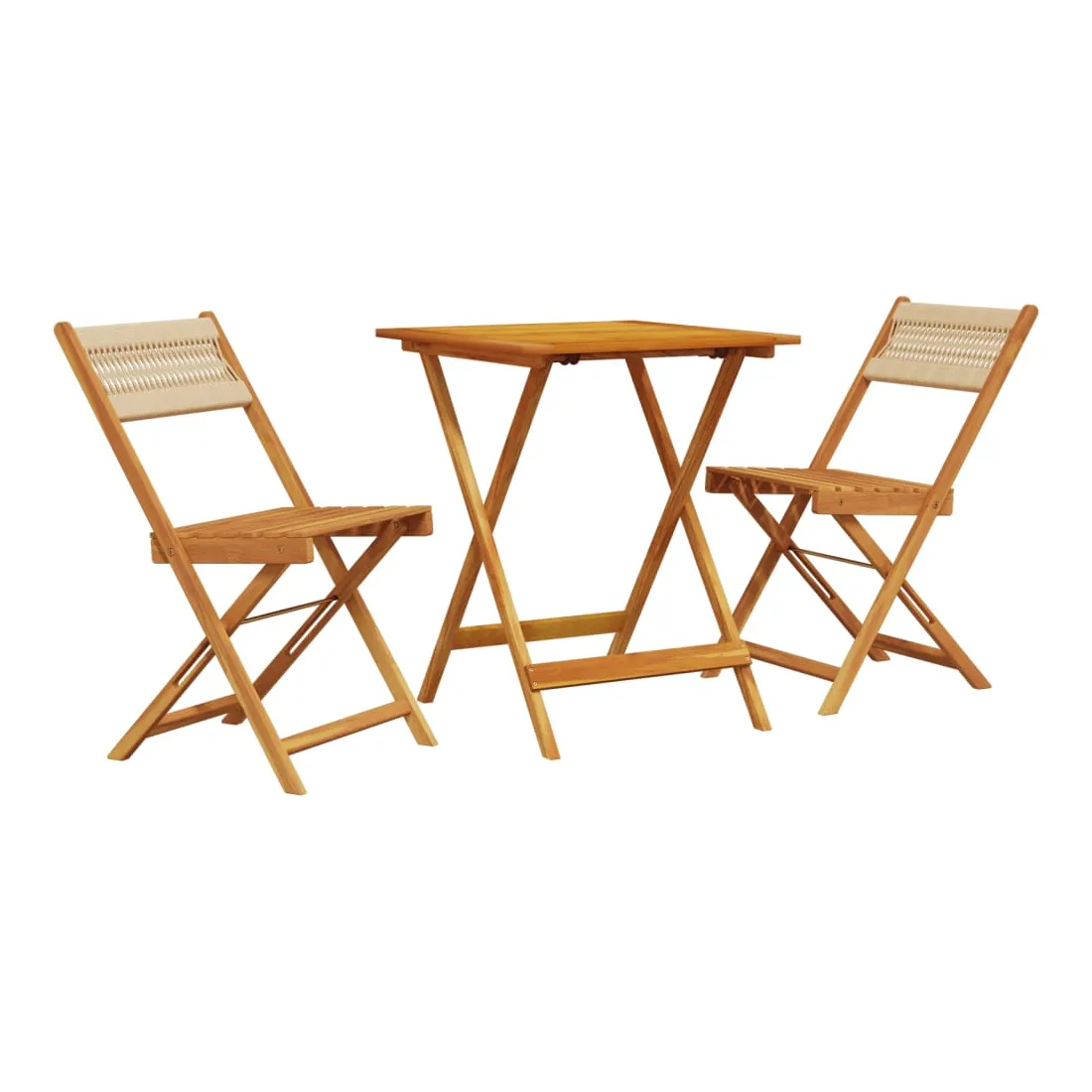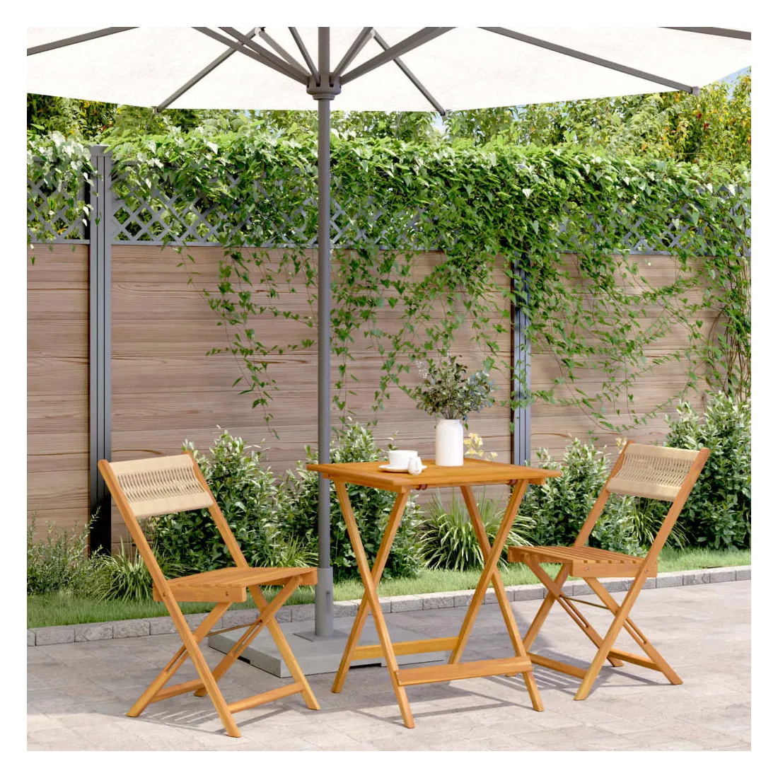 Savourez une tasse de café ou discutez avec votre famille et vos amis dans le jardin, l'arrière-cour ou sur le balcon avec cet ensemble de bistro ! Robuste et stable : le bois d'acacia massif est connu pour sa solidité et sa durabilité. Ses couleurs variées et ses grains uniques lui confèrent un aspect attrayant. Sa stabilité et sa résistance aux intempéries en font un matériau idéal pour la fabrication de meubles d'intérieur et d'extérieur.Conception pratique : la chaise d'extérieur ne comporte pas d'accoudoir, mais uniquement un dossier, ce qui vous permet d'être plus libre de vos mouvements tout en bénéficiant d'un grand confort.Dessus de table robuste : la table d'extérieur offre un excellent support pour accueillir vos boissons, collations, corbeilles de fruits et vos décorations préférées.Design pliable : la table et les chaises de salle à manger d'extérieur peuvent être facilement repliées lorsqu'elles ne sont pas utilisées pour faciliter le rangement et le transport. Bon à savoir :Pour que vos meubles d'extérieur restent beaux, nous vous recommandons de les protéger avec une housse imperméable.