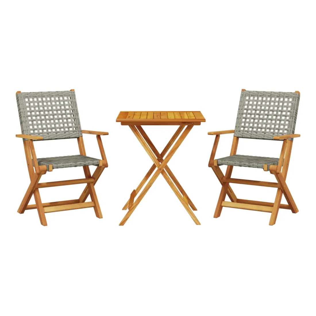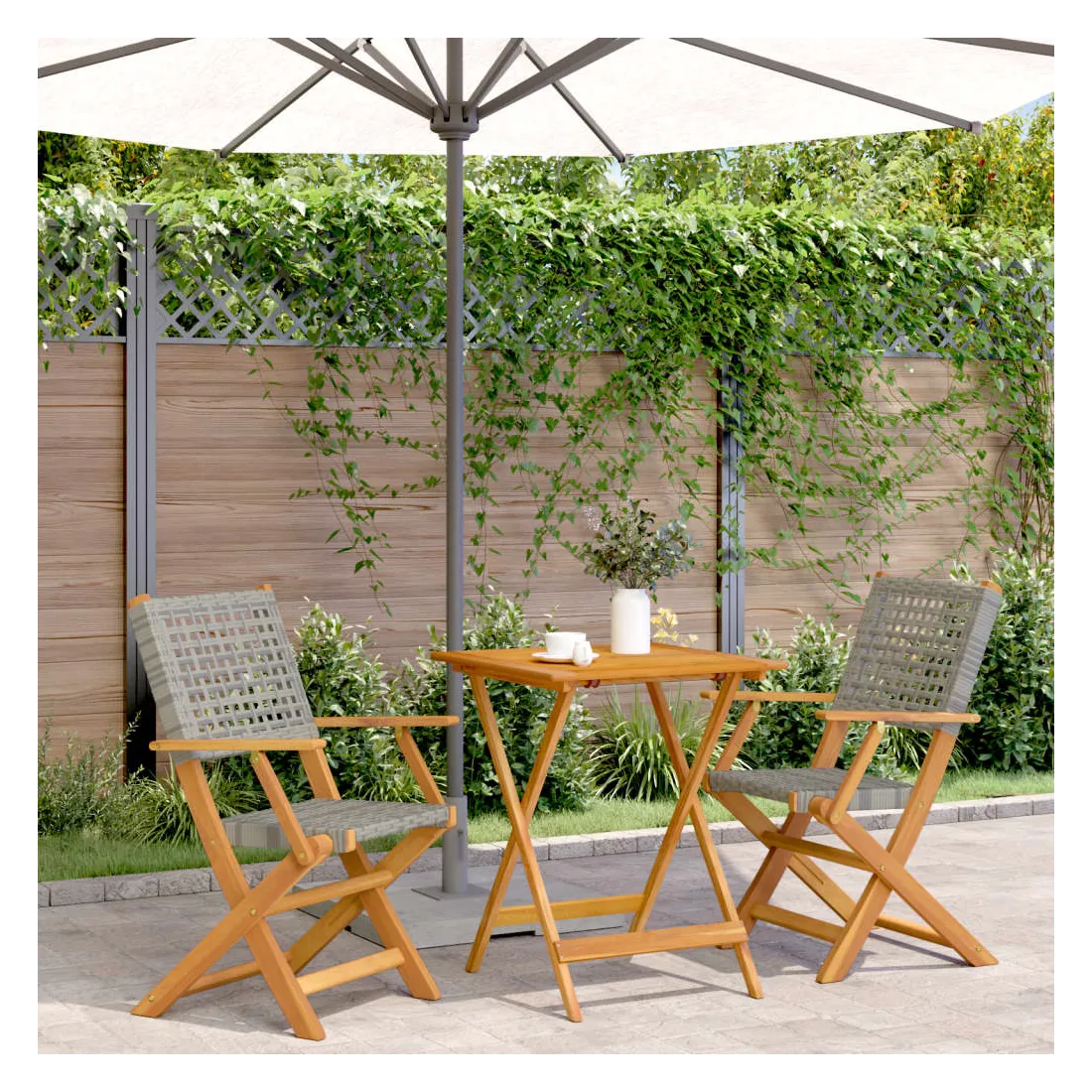 Savourez une tasse de café ou discutez avec votre famille et vos amis dans le jardin, l'arrière-cour ou sur le balcon avec cet ensemble de bistro ! Robuste et stable : le bois d'acacia massif est connu pour sa solidité et sa durabilité. Ses couleurs variées et ses grains uniques lui confèrent un aspect attrayant. Sa stabilité et sa résistance aux intempéries en font un matériau idéal pour la fabrication de meubles d'intérieur et d'extérieur.Matériau durable : la résine tressée, également connue sous le nom de poly rotin, est un matériau synthétique solide et nécessitant peu d'entretien qui ressemble au rotin naturel. Il est léger, facile à nettoyer et couramment utilisé pour les meubles d'extérieur en raison de sa durabilité et de ses propriétés de résistance aux intempéries.Conception pratique : la main courante en bois, pratique et plate, vous permet de poser vos mains dessus tout en profitant d'un moment en plein air.Dessus de table robuste : la table d'extérieur offre un excellent support pour accueillir vos boissons, collations, corbeilles de fruits et vos décorations préférées.Design pliable : la table et les chaises de salle à manger d'extérieur peuvent être facilement repliées lorsqu'elles ne sont pas utilisées pour faciliter le rangement et le transport. Bon à savoir :Pour que vos meubles d'extérieur restent beaux, nous vous recommandons de les protéger avec une housse imperméable.