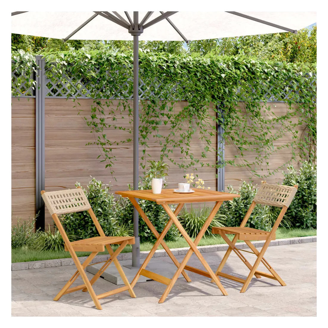 Savourez une tasse de café ou discutez avec votre famille et vos amis dans le jardin, l'arrière-cour ou sur le balcon avec cet ensemble de bistro ! Robuste et stable : le bois d'acacia massif est connu pour sa solidité et sa durabilité. Ses couleurs variées et ses grains uniques lui confèrent un aspect attrayant. Sa stabilité et sa résistance aux intempéries en font un matériau idéal pour la fabrication de meubles d'intérieur et d'extérieur.Matériau durable : la résine tressée, également connue sous le nom de poly rotin, est un matériau synthétique solide et nécessitant peu d'entretien qui ressemble au rotin naturel. Il est léger, facile à nettoyer et couramment utilisé pour les meubles d'extérieur en raison de sa durabilité et de ses propriétés de résistance aux intempéries.Conception pratique : la chaise d'extérieur ne comporte pas d'accoudoir, mais uniquement un dossier, ce qui vous permet d'être plus libre de vos mouvements tout en bénéficiant d'un grand confort.Dessus de table robuste : la table d'extérieur offre un excellent support pour accueillir vos boissons, collations, corbeilles de fruits et vos décorations préférées.Design pliable : la table et les chaises de salle à manger d'extérieur peuvent être facilement repliées lorsqu'elles ne sont pas utilisées pour faciliter le rangement et le transport. Bon à savoir :Pour que vos meubles d'extérieur restent beaux, nous vous recommandons de les protéger avec une housse imperméable.