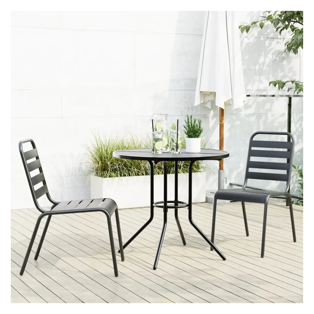 Cet ensemble de chaises de jardin avec un look élégant est un supplément frappant à votre espace de vie actuel, à l'extérieur ainsi qu'à l'intérieur. Acier enduit de poudre : cet ensemble de bar de jardin est fabriqué en acier enduit de poudre, un matériau exceptionnellement dur et solide. Elle offre robustesse et stabilité. Le revêtement en poudre de la surface de l'acier crée une couche protectrice contre la rouille, la corrosion et l'usure.Siège confortable : la chaise d’extérieur, avec son siège à lattes et son dossier incurvé, s’adapte à votre corps et offre un confort optimal.Fonction empilable : la conception empilable des chaises permet d'économiser de l'espace.Dessus de table en maille : le dessus de table en maille présente de jolis motifs et convient pour placer des boissons, de la nourriture et d'autres articles essentiels.Multifonctionnel : cet ensemble de chaises d'extérieur multifonctionnel présente une forme parfaite pour s'adapter à tous les environnements de votre maison. Il peut être utilisé dans la cuisine, la salle à manger, le salon, le patio, etc.