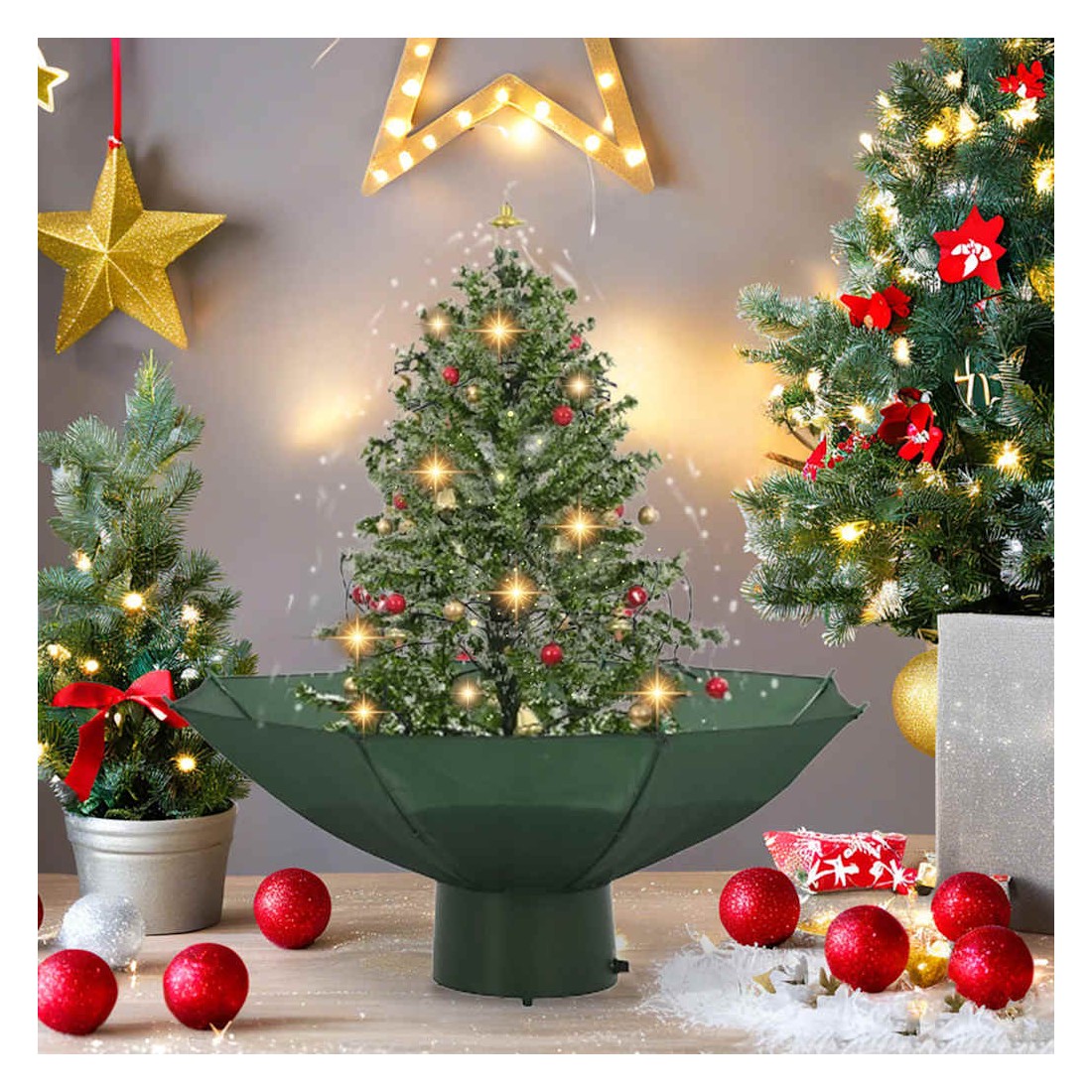 - Matériau : PVC (arbre) + polyester (parapluie + plastique (décorations)