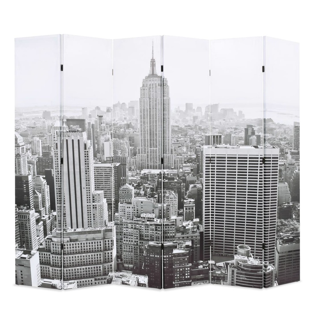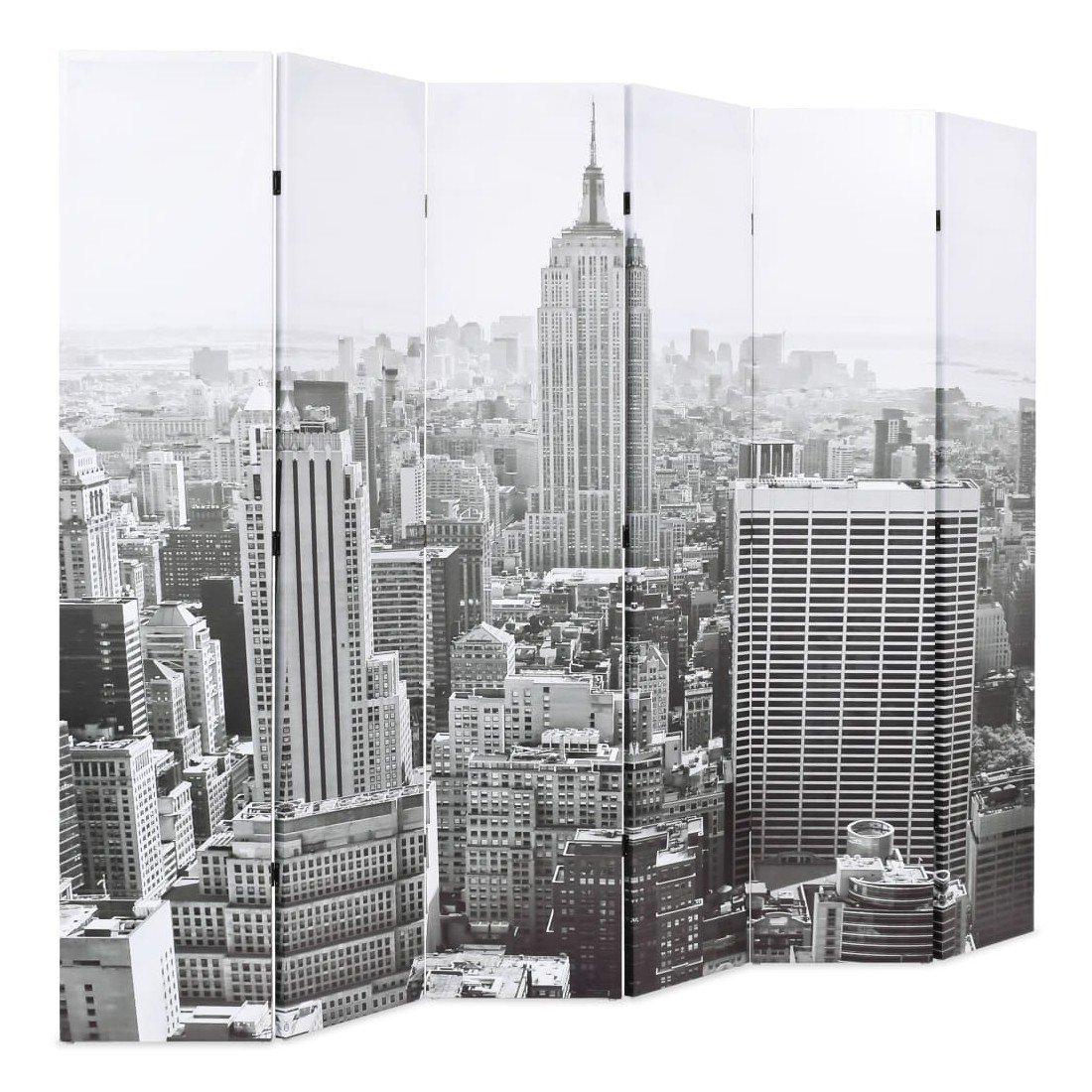 Cette cloison de séparation, mesurant 228 cm de largeur et 170 cm de hauteur, est idéale pour créer un espace intime ou séparer une partie de la chambre. Elle ajoutera une touche pratique et décorative à votre chambre à coucher, salon ou bureau. La cloison de séparation a un cadre en bois solide et est recouverte de toile résistante avec une impression photo spectaculaire représentant une vue de jour de New York et le magnifique Empire State Building en noir et blanc et ajoutera une touche de charme moderne à votre intérieur. La cloison de séparation de pièce peut également être facilement repliée pour économiser de l'espace lorsqu'elle n'est pas utilisée.