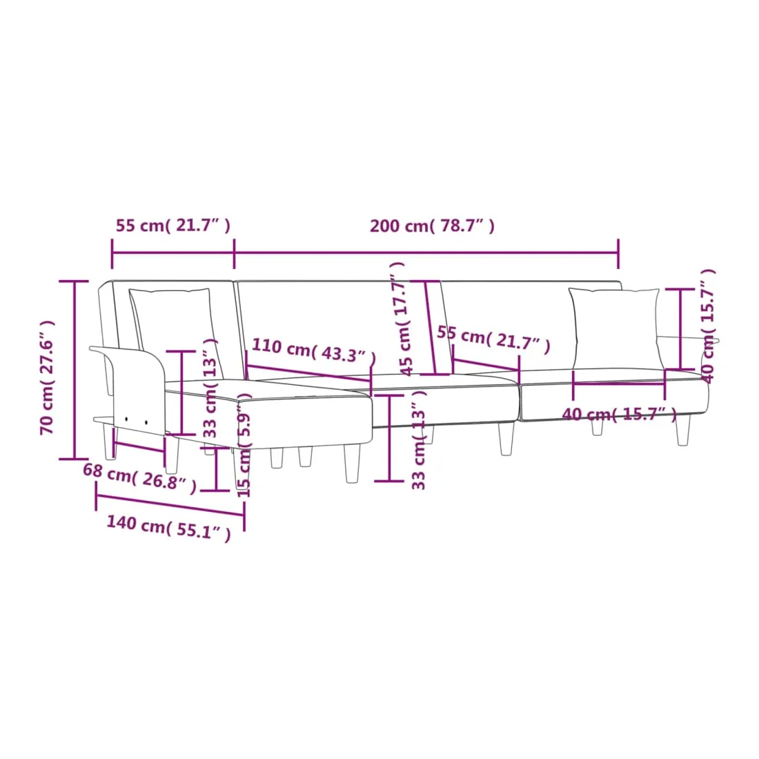 Ce canapé-lit en forme de L est parfait pour accueillir des invités pendant la nuit tout en offrant un espace confortable pour s'asseoir pendant la journée. Canapé-lit multifonctionnel : le canapé-lit est un choix judicieux pour les espaces limités. Il possède 3 positions convertibles pour s'asseoir, se prélasser et dormir, donc il peut être un canapé-lit inclinable confortable pour un usage quotidien ou un lit temporaire pour les invités.Tissu durable : le tissu présente un aspect simple et épuré, et il est respirant et durable.Cadre robuste et stable : le cadre en contreplaqué du canapé-lit assure robustesse et stabilité.Expérience d'assise confortable : doté d'un revêtement en tissu enveloppant une mousse haute densité, ce canapé-lit offre un endroit confortable et douillet pour s'asseoir et dormir. Ses accoudoirs et son dossier offrent également une détente supplémentaire. Remarque :Le produit est assemblé à côté d'un canapé-lit et d'une chaise longue. Vous pouvez mettre la chaise longue à droite ou à gauche selon vos préférences.