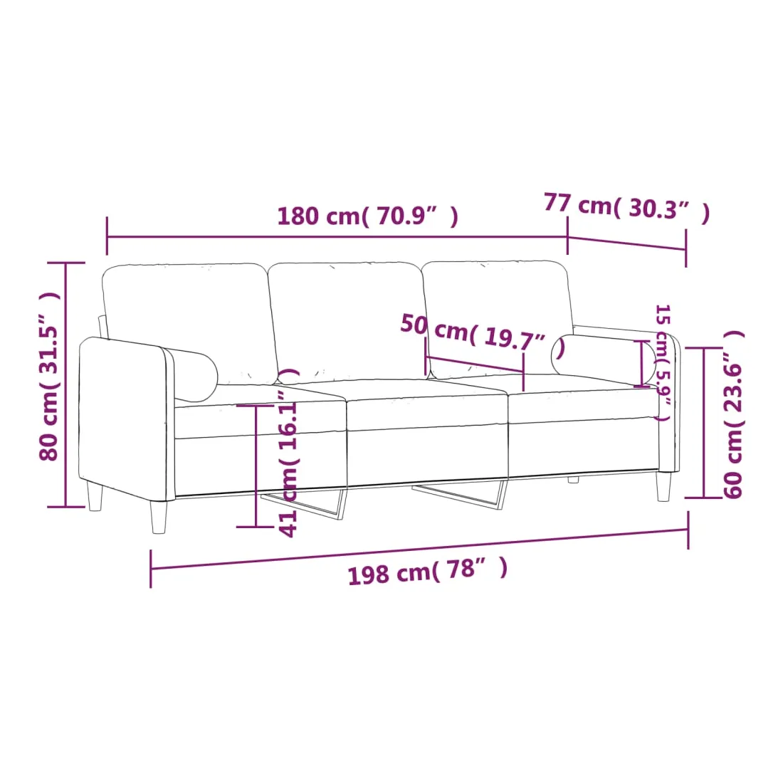 Ce canapé 3 places, qui se démarque par son design moderne et ses coussins décoratifs, sera un excellent endroit pour discuter, regarder la télévision ou simplement vous détendre. Velours doux : le velours est un tissu doux et luxueux qui se reconnaît à son tas dense de fibres uniformément coupées qui ont une touche lisse. Le tissu en velours présente un toucher doux distinctif, ce qui le rend agréable au toucher.Cadre robuste et stable : le cadre en métal du canapé de salon assure robustesse et stabilité.Housses d'oreillers amovibles : grâce à la fermeture éclair, les housses de ces oreillers de traversin sont faciles à retirer et à nettoyer en cas de besoin.Expérience d'assise confortable : le canapé est très confortable avec les sièges, les accoudoirs et les oreillers de dossier bien rembourrés. En outre, les oreillers décoratifs peuvent ajouter un confort supplémentaire lorsque vous êtes assis ou allongé.