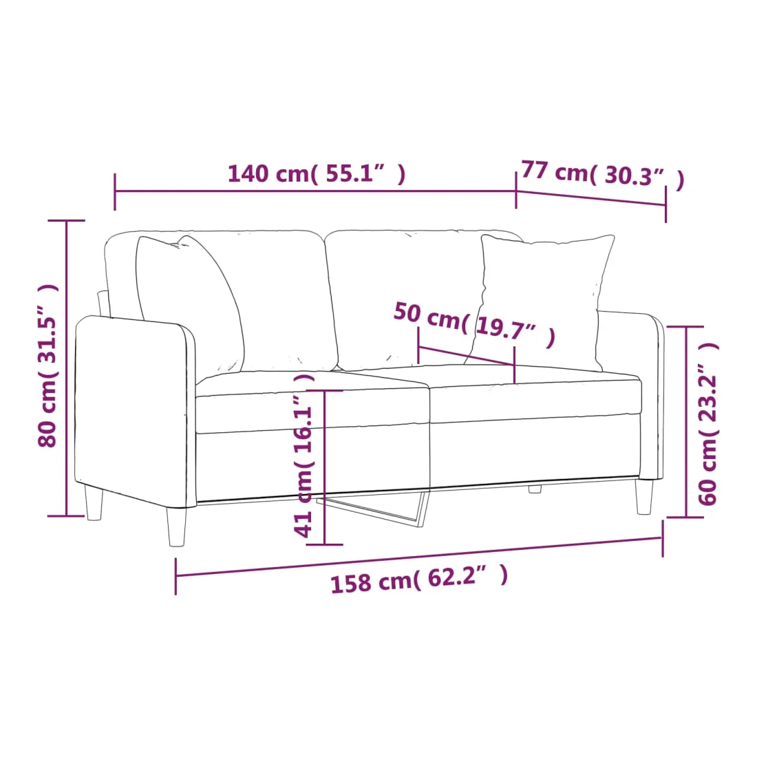 Ce canapé 2 places, qui se démarque par son design moderne et ses coussins décoratifs, sera un excellent endroit pour discuter, regarder la télévision ou simplement vous détendre. Tissu durable : le tissu présente un aspect simple et épuré tout en restant respirant et durable.Cadre robuste et stable : le cadre en métal du canapé de salon assure robustesse et stabilité.Oreillers décoratifs avec inserts : ces oreillers décoratifs sont livrés avec des inserts en coton PP, vous n'avez donc pas besoin d'acheter des rembourrages.Expérience d'assise confortable : le canapé est très confortable avec les sièges, les accoudoirs et les oreillers de dossier bien rembourrés. En outre, les oreillers décoratifs peuvent ajouter un confort supplémentaire lorsque vous êtes assis ou allongé.
