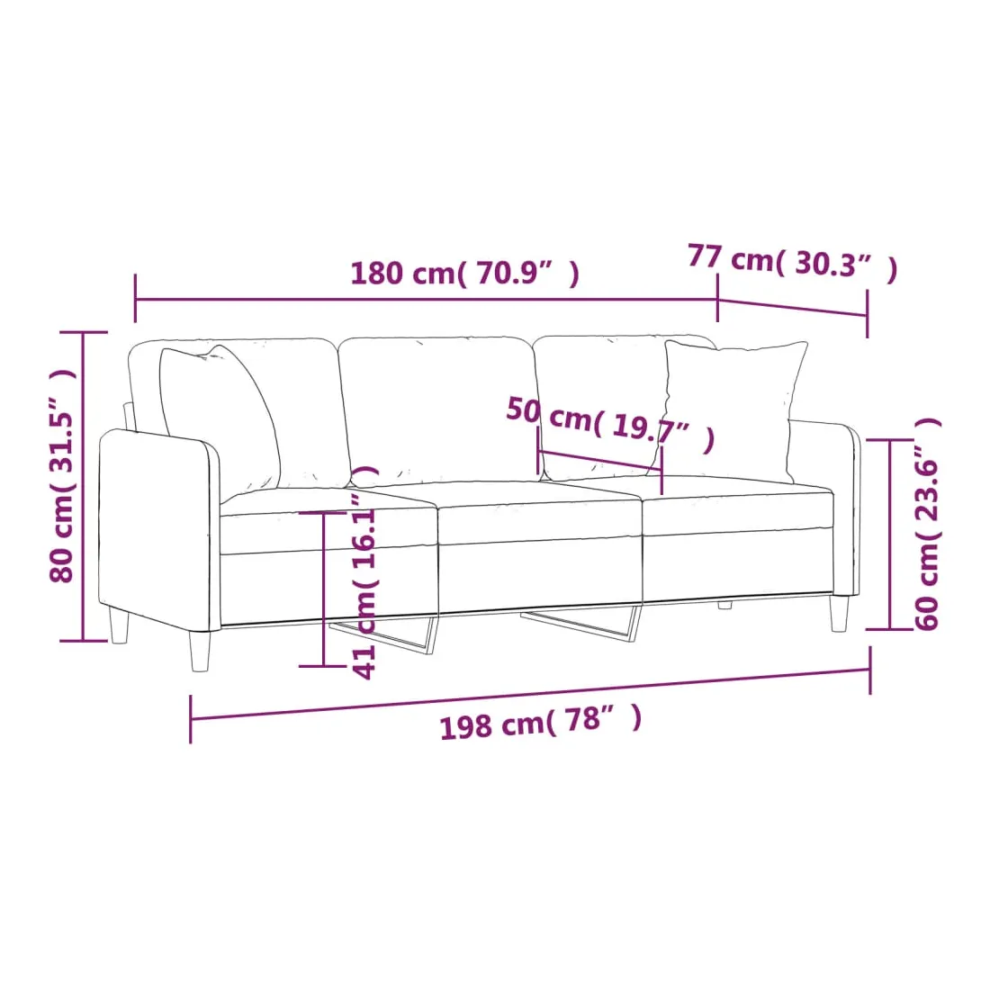 Ce canapé 3 places, qui se démarque par son design moderne et ses coussins décoratifs, sera un excellent endroit pour discuter, regarder la télévision ou simplement vous détendre. Tissu durable : le tissu présente un aspect simple et épuré tout en restant respirant et durable.Cadre robuste et stable : le cadre en métal du canapé de salon assure robustesse et stabilité.Oreillers décoratifs avec inserts : ces oreillers décoratifs sont livrés avec des inserts en coton PP, vous n'avez donc pas besoin d'acheter des rembourrages.Expérience d'assise confortable : le canapé est très confortable avec les sièges, les accoudoirs et les oreillers de dossier bien rembourrés. En outre, les oreillers décoratifs peuvent ajouter un confort supplémentaire lorsque vous êtes assis ou allongé.