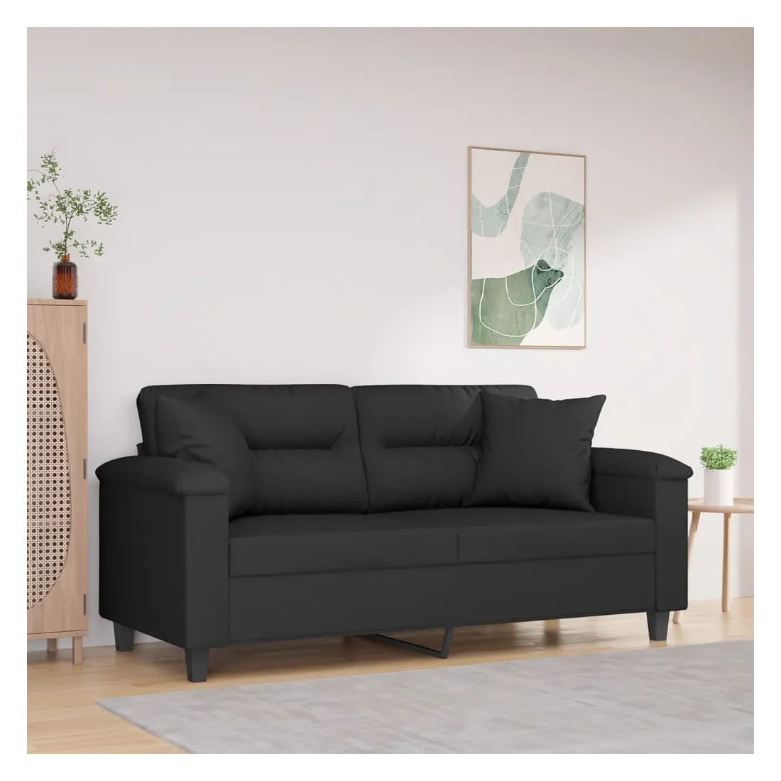 Ce canapé 2 places, qui se démarque par son design moderne et ses coussins décoratifs, sera un excellent endroit pour discuter, regarder la télévision ou simplement vous détendre. Microfibre résistant : le microfibre est un tissu synthétique composé de fibres ultra-fines, particulièrement résistantes aux taches. Le tissu en microfibre est un excellent choix pour le rembourrage des meubles en raison de sa durabilité et de son nettoyage facile.Cadre robuste et stable : le cadre en métal du canapé de salon assure robustesse et stabilité.Oreillers décoratifs avec inserts : ces oreillers décoratifs sont livrés avec des inserts en coton PP, vous n'avez donc pas besoin d'acheter des rembourrages.Expérience d'assise confortable : le canapé est très confortable avec les sièges, les accoudoirs et les oreillers de dossier bien rembourrés. En outre, les oreillers décoratifs peuvent ajouter un confort supplémentaire lorsque vous êtes assis ou allongé.