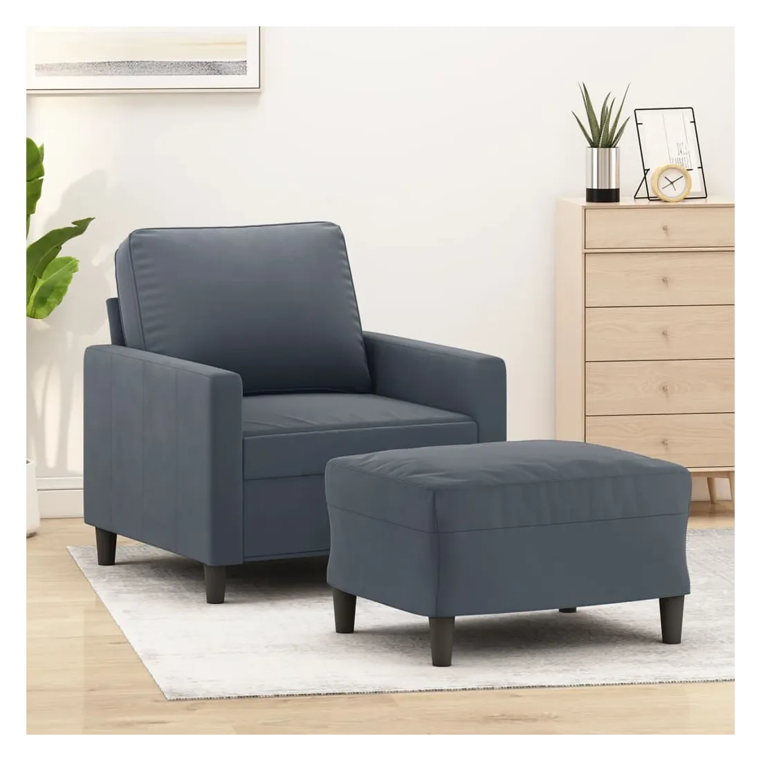 Ce fauteuil avec repose-pied est un excellent endroit pour discuter, lire, regarder la télévision ou simplement vous détendre. Il est destiné à être un point central de votre maison. Velours durable : le velours est un tissu doux et confortable, agréable au toucher.Structure robuste et stable : la structure en contreplaqué et en métal du canapé avec repose-pieds assure robustesse et stabilité.Expérience d'assise confortable : le fauteuil est très confortable avec le siège, les accoudoirs et le coussin de dossier bien rembourrés.Repose-pied polyvalent : ce repose-pied convient pour reposer vos pieds lorsque vous êtes allongé dans un canapé ou un fauteuil inclinable, ou pour vous offrir un siège supplémentaire dans votre pièce. De plus, le design simple et la taille compacte le rendent idéal pour presque tous vos espaces de vie.Design accrocheur : doté d'un design simple mais moderne, ce canapé avec repose-pied est destiné à attirer l'attention dans votre pièce.