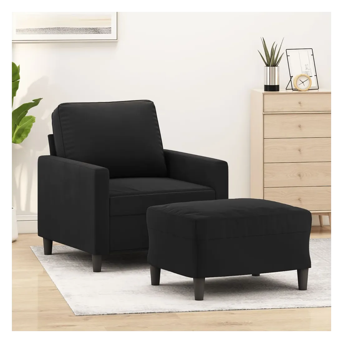 Ce fauteuil avec repose-pied est un excellent endroit pour discuter, lire, regarder la télévision ou simplement vous détendre. Il est destiné à être un point central de votre maison. Velours durable : le velours est un tissu doux et confortable, agréable au toucher.Structure robuste et stable : la structure en contreplaqué et en métal du canapé avec repose-pieds assure robustesse et stabilité.Expérience d'assise confortable : le fauteuil est très confortable avec le siège, les accoudoirs et le coussin de dossier bien rembourrés.Repose-pied polyvalent : ce repose-pied convient pour reposer vos pieds lorsque vous êtes allongé dans un canapé ou un fauteuil inclinable, ou pour vous offrir un siège supplémentaire dans votre pièce. De plus, le design simple et la taille compacte le rendent idéal pour presque tous vos espaces de vie.Design accrocheur : doté d'un design simple mais moderne, ce canapé avec repose-pied est destiné à attirer l'attention dans votre pièce.