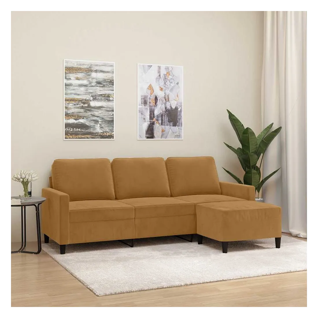 Ce canapé à 3 places avec repose-pieds est un excellent endroit pour discuter, lire, regarder la télévision ou simplement vous détendre. Il est destiné à être un point central dans votre maison. Velours durable : le velours est un tissu doux et confortable, agréable au toucher.Structure robuste et stable : la structure en contreplaqué et en métal du canapé avec repose-pieds assure robustesse et stabilité.Expérience d'assise confortable : le fauteuil est très confortable avec les sièges, les accoudoirs et les coussins de dossier bien rembourrés.Repose-pied polyvalent : ce repose-pied convient pour reposer vos pieds lorsque vous êtes allongé dans un canapé ou un fauteuil inclinable, ou pour vous offrir un siège supplémentaire dans votre pièce. De plus, le design simple et la taille compacte le rendent idéal pour presque tous vos espaces de vie.Design accrocheur : doté d'un design simple mais moderne, ce canapé avec repose-pied est destiné à attirer l'attention dans votre pièce.