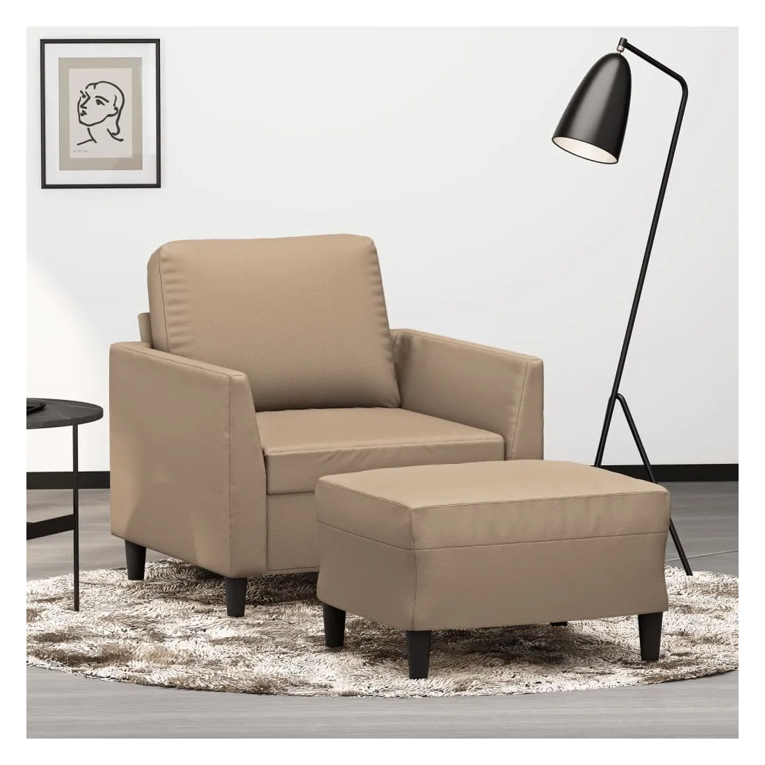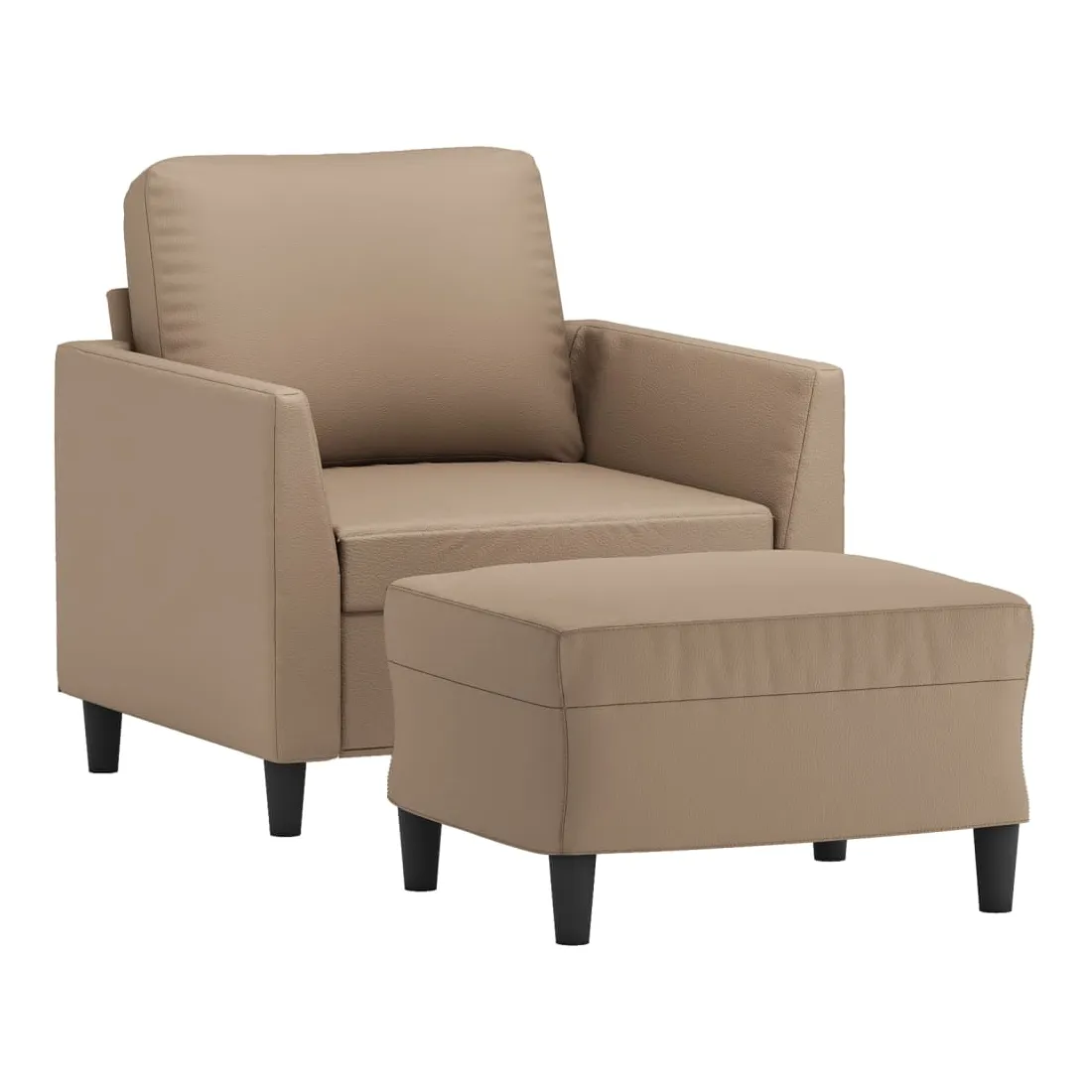 Ce fauteuil avec repose-pied est un excellent endroit pour discuter, lire, regarder la télévision ou simplement vous détendre. Il est destiné à être un point central de votre maison. Similicuir durable : le similicuir de qualité supérieure est un matériau très durable. Il est résistant aux taches, ce qui le rend facile à nettoyer avec un chiffon humide. La surface lisse donne également un aspect luxueux et la beauté du cuir véritable.Structure robuste et stable : la structure en contreplaqué et en métal du canapé avec repose-pieds assure robustesse et stabilité.Expérience d'assise confortable : le fauteuil est très confortable avec le siège, les accoudoirs et le coussin de dossier bien rembourrés.Repose-pied polyvalent : ce repose-pied convient pour reposer vos pieds lorsque vous êtes allongé dans un canapé ou un fauteuil inclinable, ou pour vous offrir un siège supplémentaire dans votre pièce. De plus, le design simple et la taille compacte le rendent idéal pour presque tous vos espaces de vie.Design accrocheur : doté d'un design simple mais moderne, ce canapé avec repose-pied est destiné à attirer l'attention dans votre pièce.