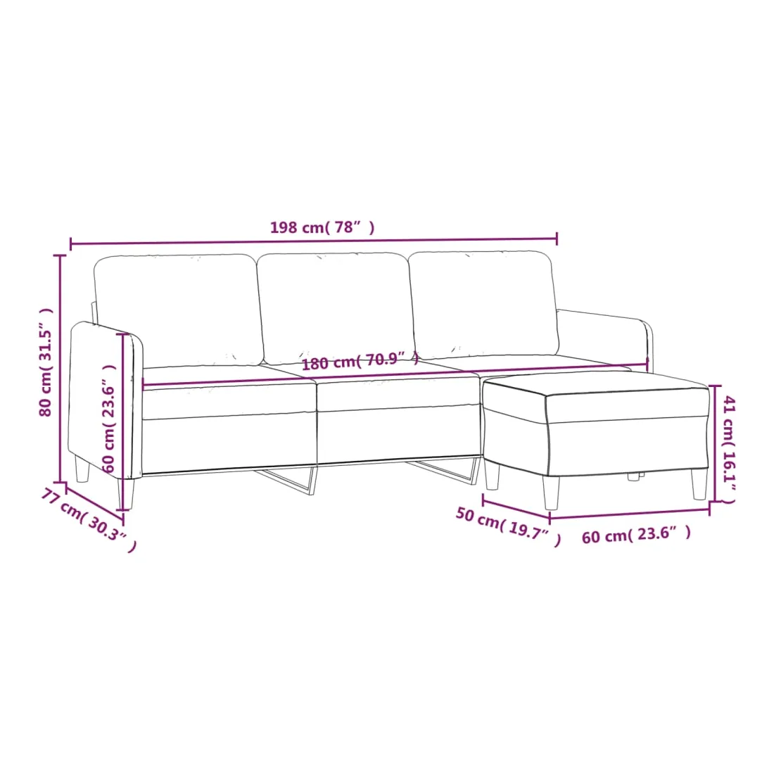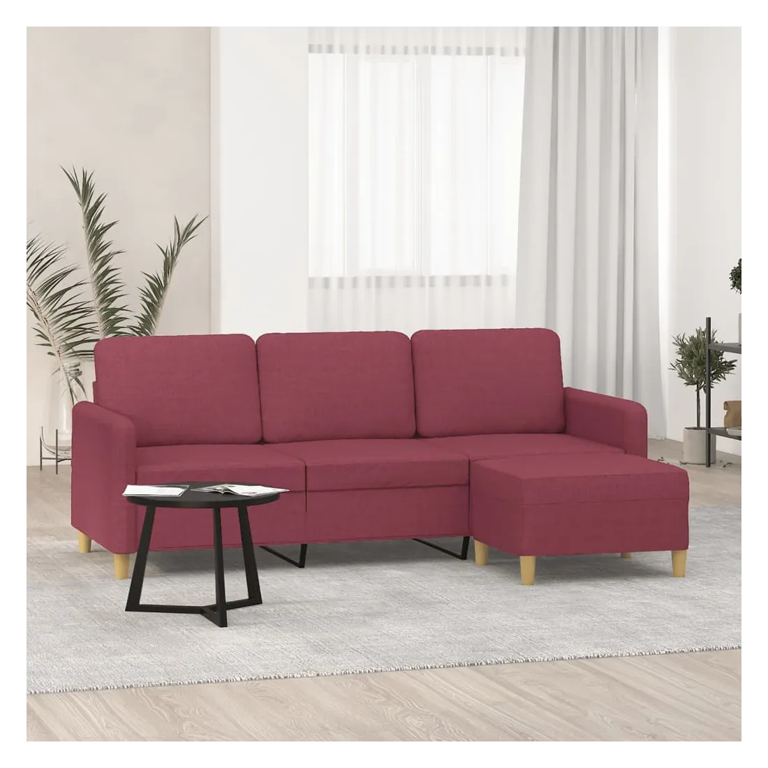 Ce canapé à 3 places avec repose-pieds est un excellent endroit pour discuter, lire, regarder la télévision ou simplement vous détendre. Il est destiné à être un point central dans votre maison. Tissu durable : le tissu présente un aspect simple et épuré tout en restant respirant et durable.Structure robuste et stable : la structure en contreplaqué et en métal du canapé avec repose-pieds assure robustesse et stabilité.Expérience d'assise confortable : le fauteuil est très confortable avec les sièges, les accoudoirs et les coussins de dossier bien rembourrés.Repose-pied polyvalent : ce repose-pied convient pour reposer vos pieds lorsque vous êtes allongé dans un canapé ou un fauteuil inclinable, ou pour vous offrir un siège supplémentaire dans votre pièce. De plus, le design simple et la taille compacte le rendent idéal pour presque tous vos espaces de vie.Design accrocheur : doté d'un design simple mais moderne, ce canapé avec repose-pied est destiné à attirer l'attention dans votre pièce.