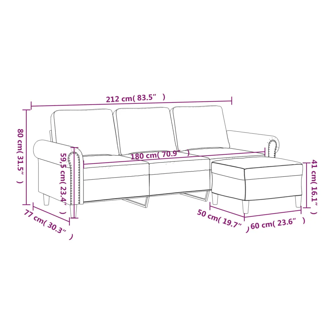 - Dimensions totales : 212 x 77 x 80 cm (l x P x H)