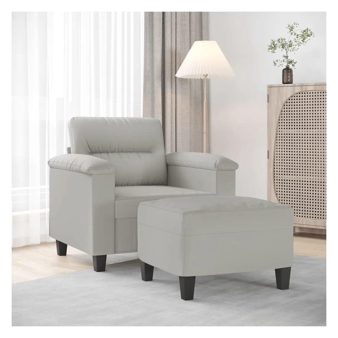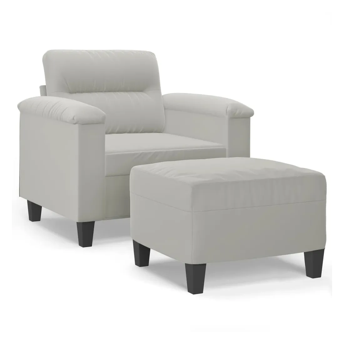 Ce fauteuil avec repose-pied est un excellent endroit pour discuter, lire, regarder la télévision ou simplement vous détendre. Il est destiné à être un point central de votre maison. Tissu microfibre durable : le microfibre est un tissu synthétique composé de fibres ultra-fines, particulièrement résistantes aux taches. Le tissu en microfibre est un excellent choix pour le rembourrage des meubles en raison de sa durabilité et de son nettoyage facile.Structure robuste et stable : la structure en contreplaqué et en métal du canapé avec repose-pieds assure robustesse et stabilité.Expérience d'assise confortable : le fauteuil est très confortable avec le siège, les accoudoirs et le coussin de dossier bien rembourrés.Repose-pied polyvalent : ce repose-pied convient pour reposer vos pieds lorsque vous êtes allongé dans un canapé ou un fauteuil inclinable, ou pour vous offrir un siège supplémentaire dans votre pièce. De plus, le design simple et la taille compacte le rendent idéal pour presque tous vos espaces de vie.Design accrocheur : doté d'un design simple mais moderne, ce canapé avec repose-pied est destiné à attirer l'attention dans votre pièce.