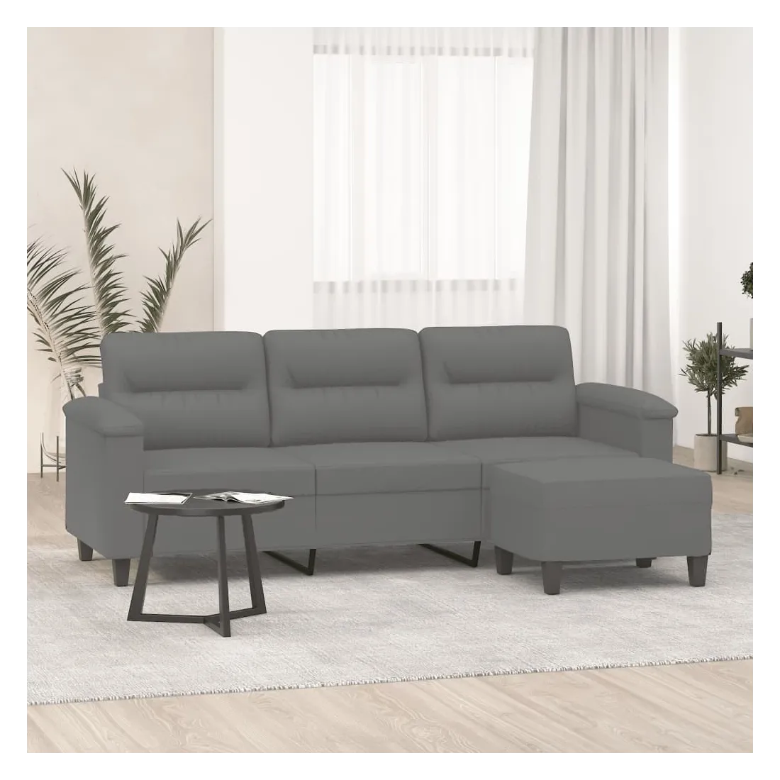 Ce canapé à 3 places avec repose-pieds est un excellent endroit pour discuter, lire, regarder la télévision ou simplement vous détendre. Il est destiné à être un point central dans votre maison. Tissu microfibre durable : le microfibre est un tissu synthétique composé de fibres ultra-fines, particulièrement résistantes aux taches. Le tissu en microfibre est un excellent choix pour le rembourrage des meubles en raison de sa durabilité et de son nettoyage facile.Structure robuste et stable : la structure en contreplaqué et en métal du canapé avec repose-pieds assure robustesse et stabilité.Expérience d'assise confortable : le fauteuil est très confortable avec les sièges, les accoudoirs et les coussins de dossier bien rembourrés.Repose-pied polyvalent : ce repose-pied convient pour reposer vos pieds lorsque vous êtes allongé dans un canapé ou un fauteuil inclinable, ou pour vous offrir un siège supplémentaire dans votre pièce. De plus, le design simple et la taille compacte le rendent idéal pour presque tous vos espaces de vie.Design accrocheur : doté d'un design simple mais moderne, ce canapé avec repose-pied est destiné à attirer l'attention dans votre pièce.