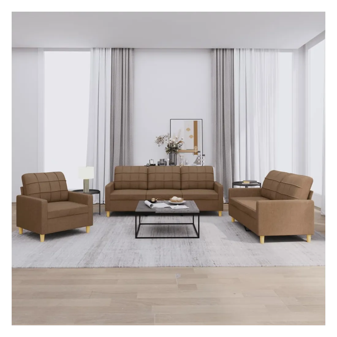 Cet ensemble de canapés est un excellent endroit pour discuter, lire, regarder la télévision ou simplement vous détendre. Il est destiné à être un point central de votre maison. Tissu durable : le tissu présente un aspect simple et épuré tout en restant respirant et durable.Structure robuste et stable : la structure en contreplaqué et en métal du canapé assure robustesse et stabilité.Expérience d'assise confortable : le canapé est très confortable avec le siège, les accoudoirs et les oreillers de dossier bien rembourrés.Design accrocheur : doté d'un design simple mais moderne, ce siège de salon est destiné à attirer l'attention dans votre pièce.