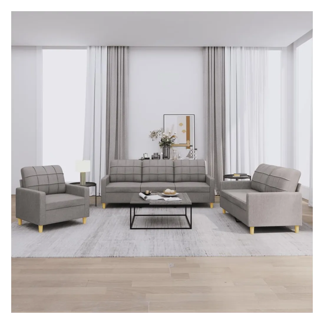 Cet ensemble de canapés est un excellent endroit pour discuter, lire, regarder la télévision ou simplement vous détendre. Il est destiné à être un point central de votre maison. Tissu durable : le tissu présente un aspect simple et épuré tout en restant respirant et durable.Structure robuste et stable : la structure en contreplaqué et en métal du canapé assure robustesse et stabilité.Expérience d'assise confortable : le canapé est très confortable avec le siège, les accoudoirs et les oreillers de dossier bien rembourrés.Design accrocheur : doté d'un design simple mais moderne, ce siège de salon est destiné à attirer l'attention dans votre pièce.