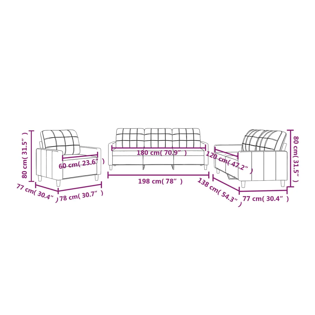 - Dimensions totales : 198 x 77 x 80 cm (l x P x H)
