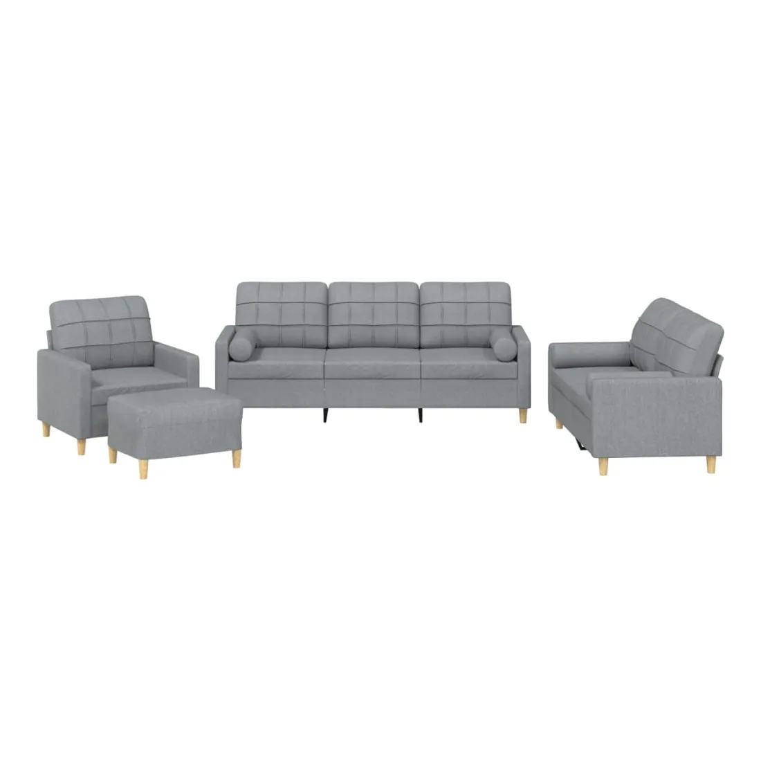 Cet ensemble de canapés est un excellent endroit pour discuter, lire, regarder la télévision ou simplement vous détendre. Il est destiné à être un point central de votre maison. Tissu durable : le tissu présente un aspect simple et épuré tout en restant respirant et durable.Structure robuste et stable : la structure en contreplaqué et en métal du canapé assure robustesse et stabilité.Expérience d'assise confortable : le canapé est très confortable avec le siège, les accoudoirs et les oreillers de dossier bien rembourrés.Oreillers cylindriques pratiques : ces oreillers cylindriques non seulement embellissent votre décor, mais ils peuvent également apporter un confort supplémentaire lorsque vous êtes assis ou allongé.Pouf polyvalent : ce repose-pied convient pour reposer vos pieds lorsque vous êtes allongé dans un canapé, ou pour vous offrir un siège supplémentaire dans votre pièce. De plus, le design simple et la taille compacte le rendent idéal pour presque tous vos espaces de vie.