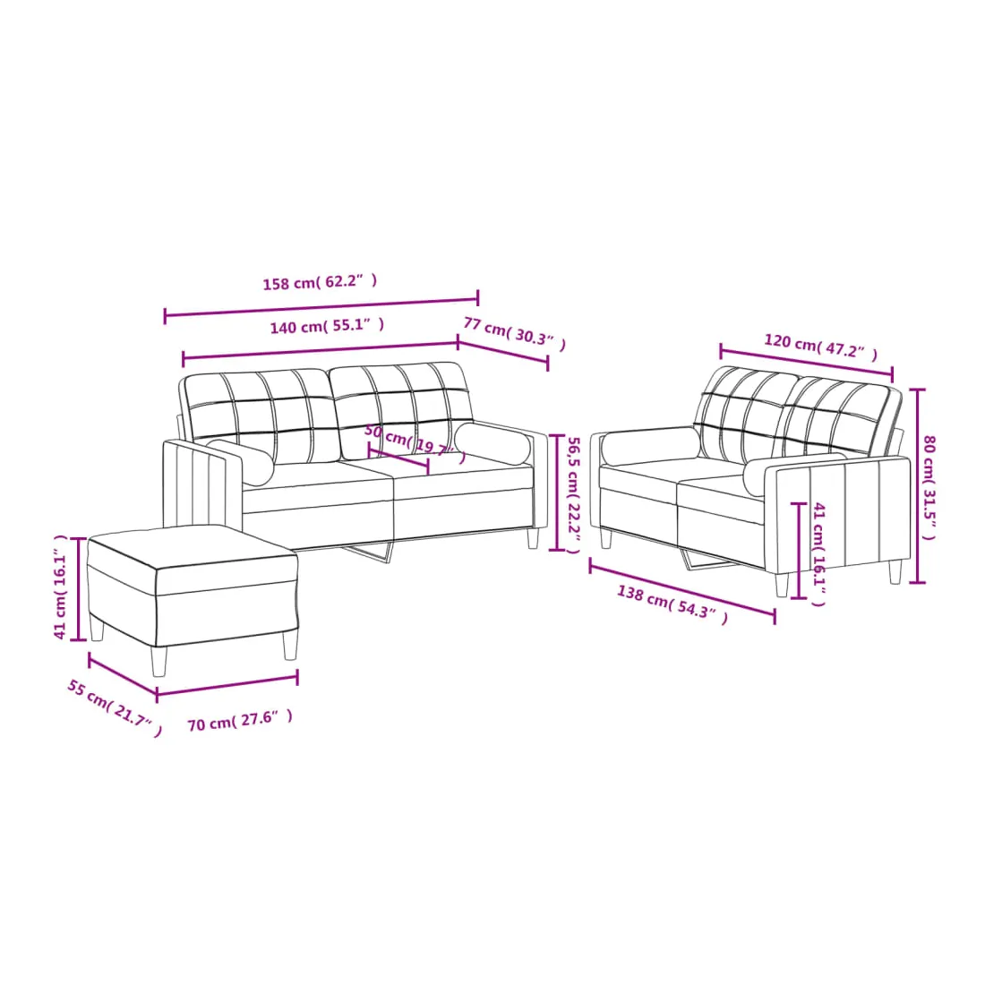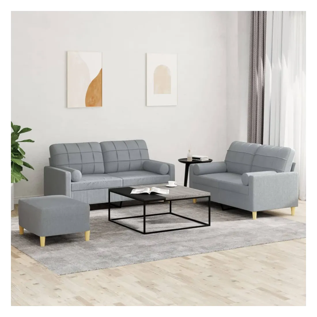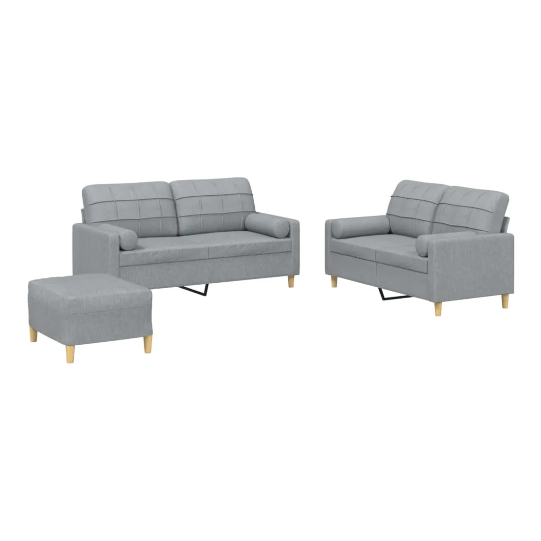 Cet ensemble de canapés est un excellent endroit pour discuter, lire, regarder la télévision ou simplement vous détendre. Il est destiné à être un point central de votre maison. Tissu durable : le tissu présente un aspect simple et épuré tout en restant respirant et durable.Structure robuste et stable : la structure en contreplaqué et en métal du canapé assure robustesse et stabilité.Expérience d'assise confortable : le canapé est très confortable avec le siège, les accoudoirs et les oreillers de dossier bien rembourrés.Oreillers cylindriques pratiques : ces oreillers cylindriques non seulement embellissent votre décor, mais ils peuvent également apporter un confort supplémentaire lorsque vous êtes assis ou allongé.Pouf polyvalent : ce repose-pied convient pour reposer vos pieds lorsque vous êtes allongé dans un canapé, ou pour vous offrir un siège supplémentaire dans votre pièce. De plus, le design simple et la taille compacte le rendent idéal pour presque tous vos espaces de vie.