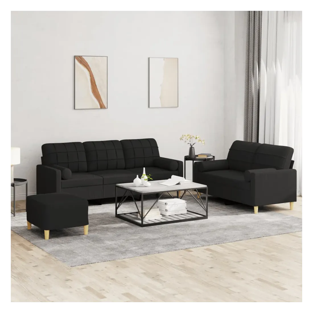 Cet ensemble de canapés est un excellent endroit pour discuter, lire, regarder la télévision ou simplement vous détendre. Il est destiné à être un point central de votre maison. Tissu durable : le tissu présente un aspect simple et épuré tout en restant respirant et durable.Structure robuste et stable : la structure en contreplaqué et en métal du canapé assure robustesse et stabilité.Expérience d'assise confortable : le canapé est très confortable avec le siège, les accoudoirs et les oreillers de dossier bien rembourrés.Oreillers cylindriques pratiques : ces oreillers cylindriques non seulement embellissent votre décor, mais ils peuvent également apporter un confort supplémentaire lorsque vous êtes assis ou allongé.Pouf polyvalent : ce repose-pied convient pour reposer vos pieds lorsque vous êtes allongé dans un canapé, ou pour vous offrir un siège supplémentaire dans votre pièce. De plus, le design simple et la taille compacte le rendent idéal pour presque tous vos espaces de vie.