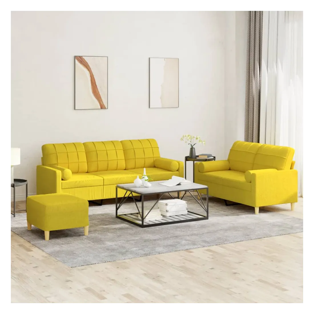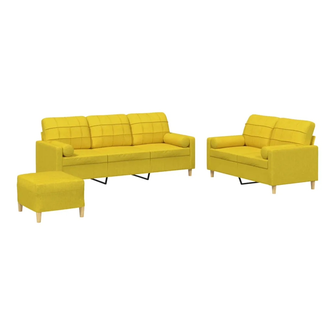 Cet ensemble de canapés est un excellent endroit pour discuter, lire, regarder la télévision ou simplement vous détendre. Il est destiné à être un point central de votre maison. Tissu durable : le tissu présente un aspect simple et épuré tout en restant respirant et durable.Structure robuste et stable : la structure en contreplaqué et en métal du canapé assure robustesse et stabilité.Expérience d'assise confortable : le canapé est très confortable avec le siège, les accoudoirs et les oreillers de dossier bien rembourrés.Oreillers cylindriques pratiques : ces oreillers cylindriques non seulement embellissent votre décor, mais ils peuvent également apporter un confort supplémentaire lorsque vous êtes assis ou allongé.Pouf polyvalent : ce repose-pied convient pour reposer vos pieds lorsque vous êtes allongé dans un canapé, ou pour vous offrir un siège supplémentaire dans votre pièce. De plus, le design simple et la taille compacte le rendent idéal pour presque tous vos espaces de vie.