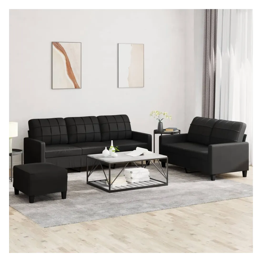 Cet ensemble de canapés est un excellent endroit pour discuter, lire, regarder la télévision ou simplement vous détendre. Il est destiné à être un point central de votre maison. Similicuir durable : le similicuir de qualité supérieure est un matériau très durable. Il est résistant aux taches, ce qui le rend facile à nettoyer avec un chiffon humide. La surface lisse donne également un aspect luxueux et la beauté du cuir véritable.Structure robuste et stable : la structure en contreplaqué et en métal du canapé assure robustesse et stabilité.Expérience d'assise confortable : le canapé est très confortable avec le siège, les accoudoirs et les oreillers de dossier bien rembourrés.Pouf polyvalent : ce repose-pied convient pour reposer vos pieds lorsque vous êtes allongé dans un canapé, ou pour vous offrir un siège supplémentaire dans votre pièce. De plus, le design simple et la taille compacte le rendent idéal pour presque tous vos espaces de vie.