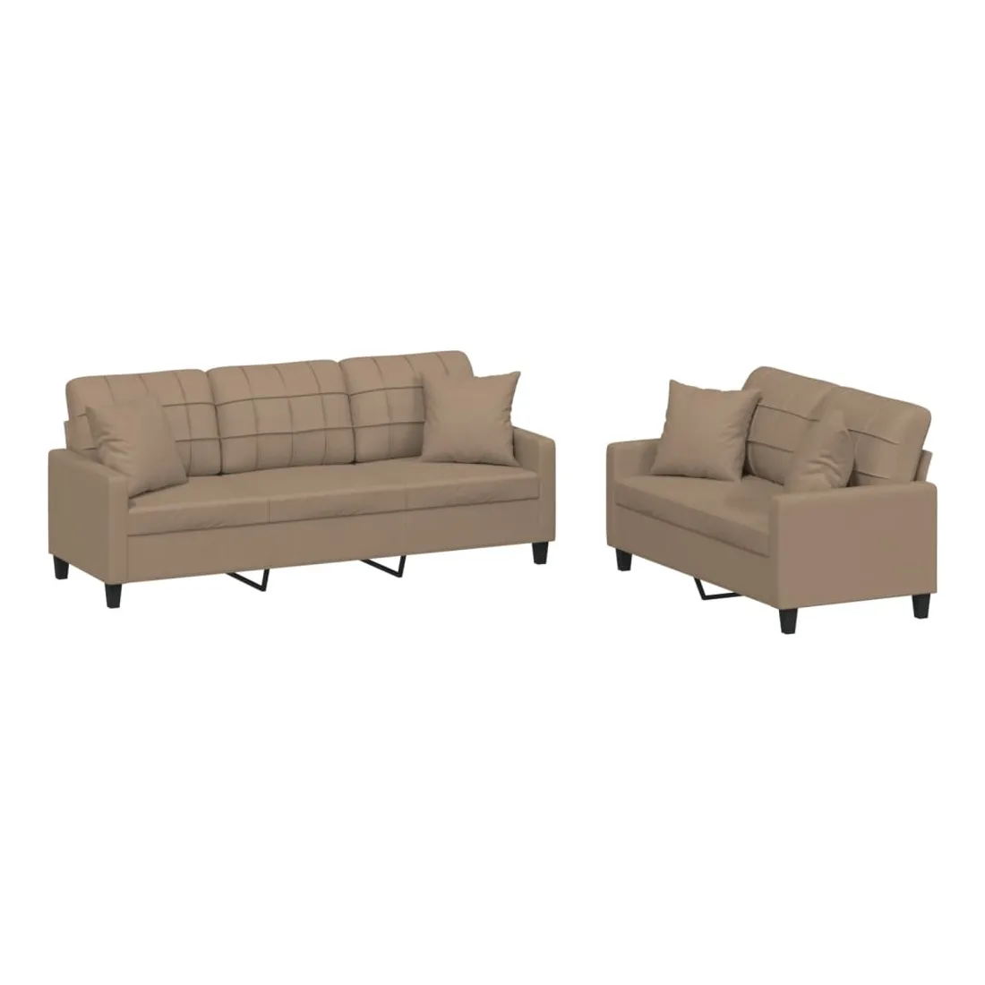 Cet ensemble de canapés est un excellent endroit pour discuter, lire, regarder la télévision ou simplement vous détendre. Il est destiné à être un point central de votre maison. Similicuir durable : le similicuir de qualité supérieure est un matériau très durable. Il est résistant aux taches, ce qui le rend facile à nettoyer avec un chiffon humide. La surface lisse donne également un aspect luxueux et la beauté du cuir véritable.Structure robuste et stable : la structure en contreplaqué et en métal du canapé assure robustesse et stabilité.Expérience d'assise confortable : le canapé est très confortable avec le siège, les accoudoirs et les oreillers de dossier bien rembourrés.Oreillers de canapé pratiques : ces oreillers décoratifs carrés non seulement embellissent votre décor, mais ils peuvent également apporter un confort supplémentaire lorsque vous êtes assis ou allongé.