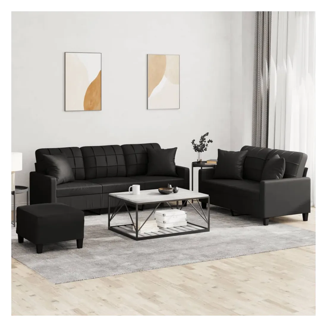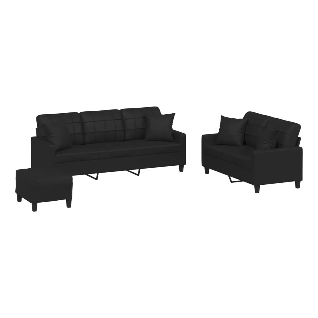Cet ensemble de canapés est un excellent endroit pour discuter, lire, regarder la télévision ou simplement vous détendre. Il est destiné à être un point central de votre maison. Similicuir durable : le similicuir de qualité supérieure est un matériau très durable. Il est résistant aux taches, ce qui le rend facile à nettoyer avec un chiffon humide. La surface lisse donne également un aspect luxueux et la beauté du cuir véritable.Structure robuste et stable : la structure en contreplaqué et en métal du canapé assure robustesse et stabilité.Expérience d'assise confortable : le canapé est très confortable avec le siège, les accoudoirs et les oreillers de dossier bien rembourrés.Oreillers de canapé pratiques : ces oreillers décoratifs carrés non seulement embellissent votre décor, mais ils peuvent également apporter un confort supplémentaire lorsque vous êtes assis ou allongé.Pouf polyvalent : ce repose-pied convient pour reposer vos pieds lorsque vous êtes allongé dans un canapé, ou pour vous offrir un siège supplémentaire dans votre pièce. De plus, le design simple et la taille compacte le rendent idéal pour presque tous vos espaces de vie.