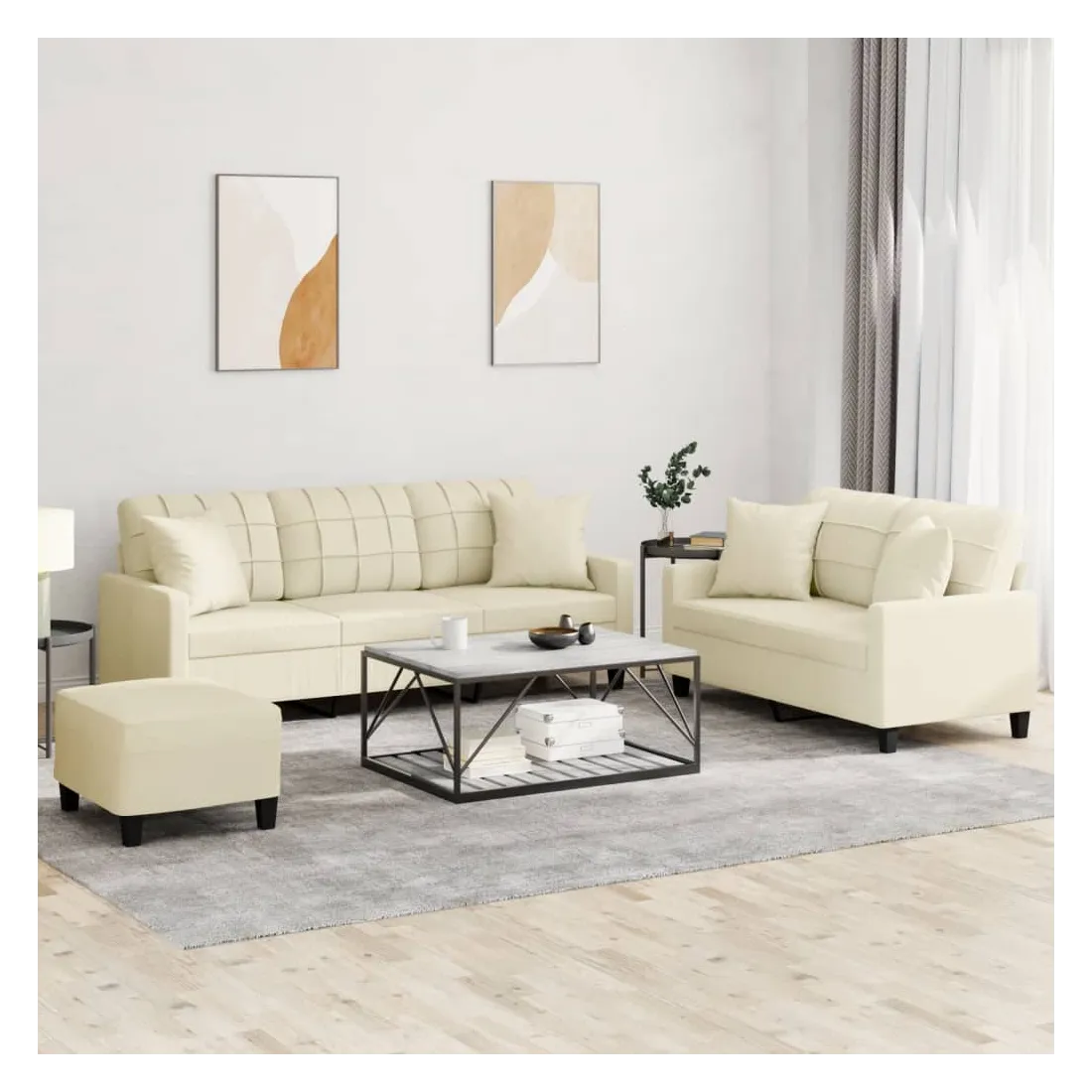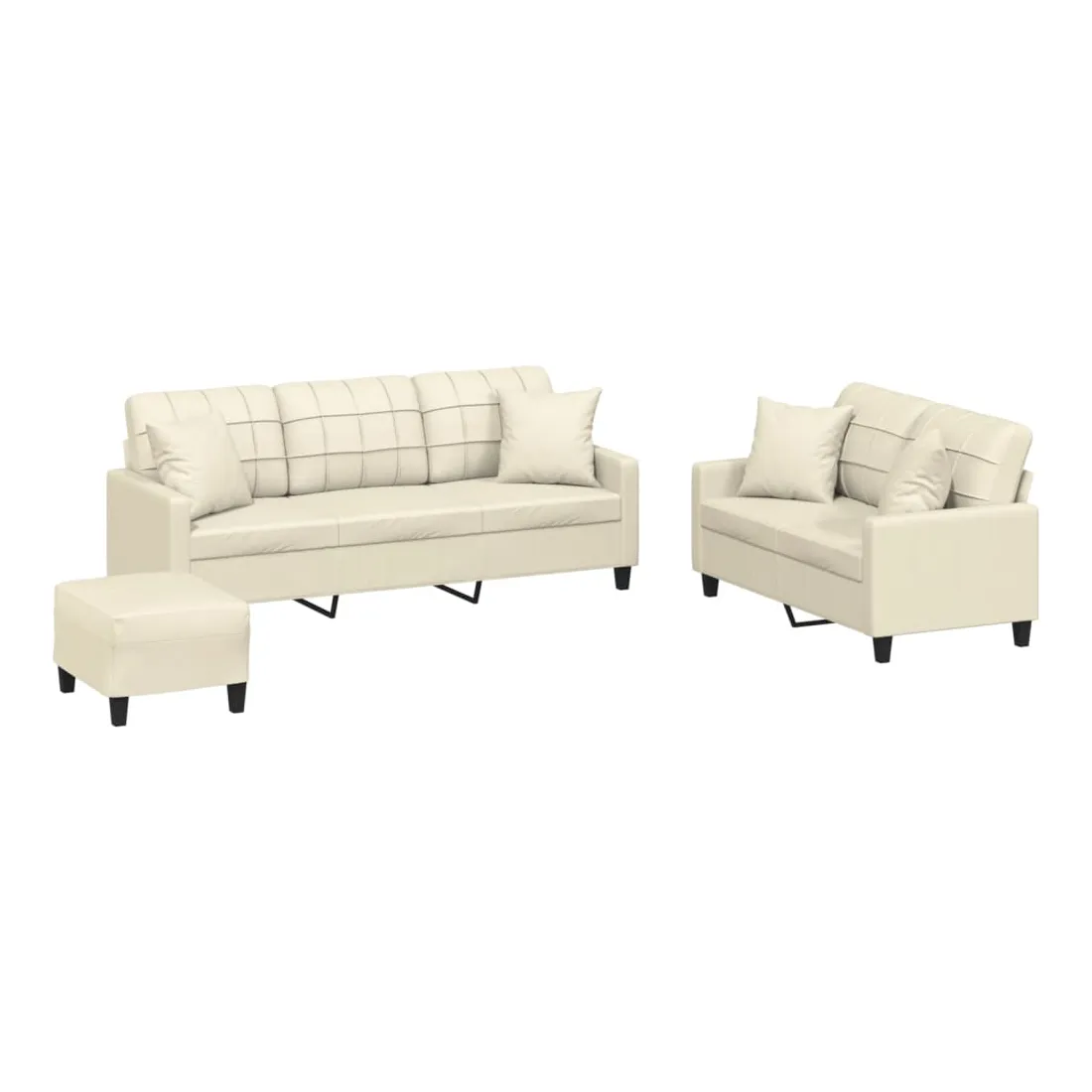 Cet ensemble de canapés est un excellent endroit pour discuter, lire, regarder la télévision ou simplement vous détendre. Il est destiné à être un point central de votre maison. Similicuir durable : le similicuir de qualité supérieure est un matériau très durable. Il est résistant aux taches, ce qui le rend facile à nettoyer avec un chiffon humide. La surface lisse donne également un aspect luxueux et la beauté du cuir véritable.Structure robuste et stable : la structure en contreplaqué et en métal du canapé assure robustesse et stabilité.Expérience d'assise confortable : le canapé est très confortable avec le siège, les accoudoirs et les oreillers de dossier bien rembourrés.Oreillers de canapé pratiques : ces oreillers décoratifs carrés non seulement embellissent votre décor, mais ils peuvent également apporter un confort supplémentaire lorsque vous êtes assis ou allongé.Pouf polyvalent : ce repose-pied convient pour reposer vos pieds lorsque vous êtes allongé dans un canapé, ou pour vous offrir un siège supplémentaire dans votre pièce. De plus, le design simple et la taille compacte le rendent idéal pour presque tous vos espaces de vie.